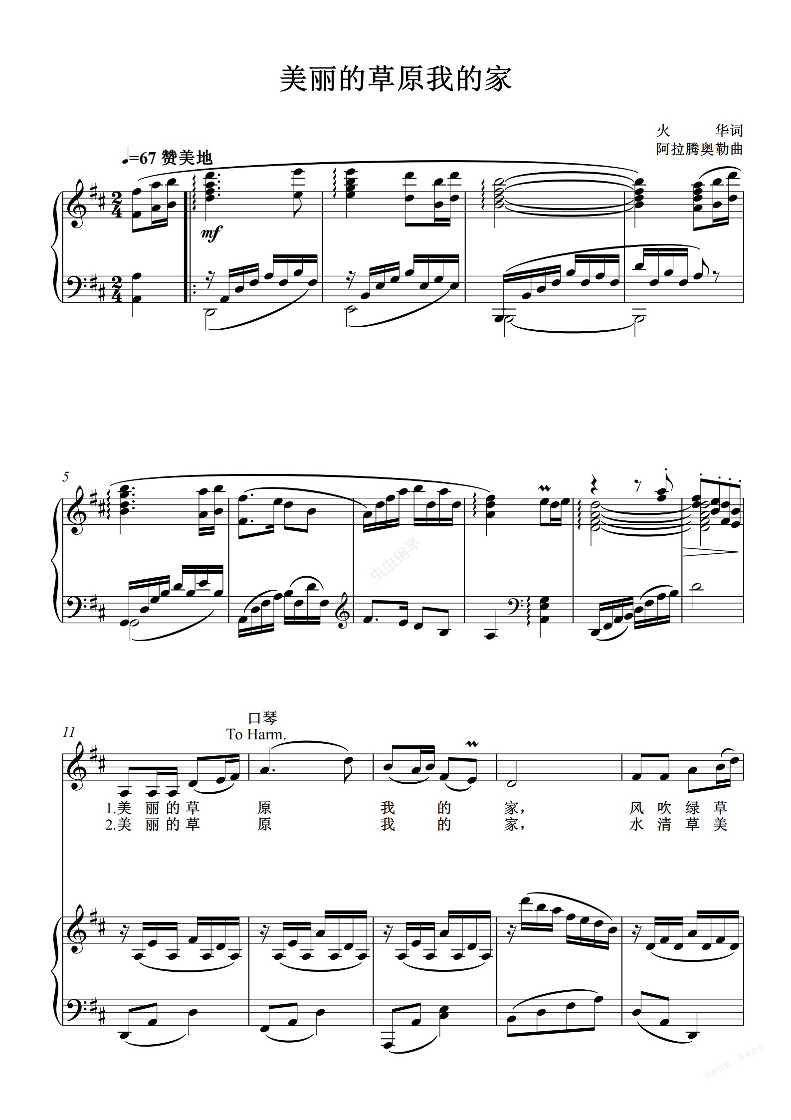 钢琴谱:美丽的草原我的家-德德玛 完美弹唱D调