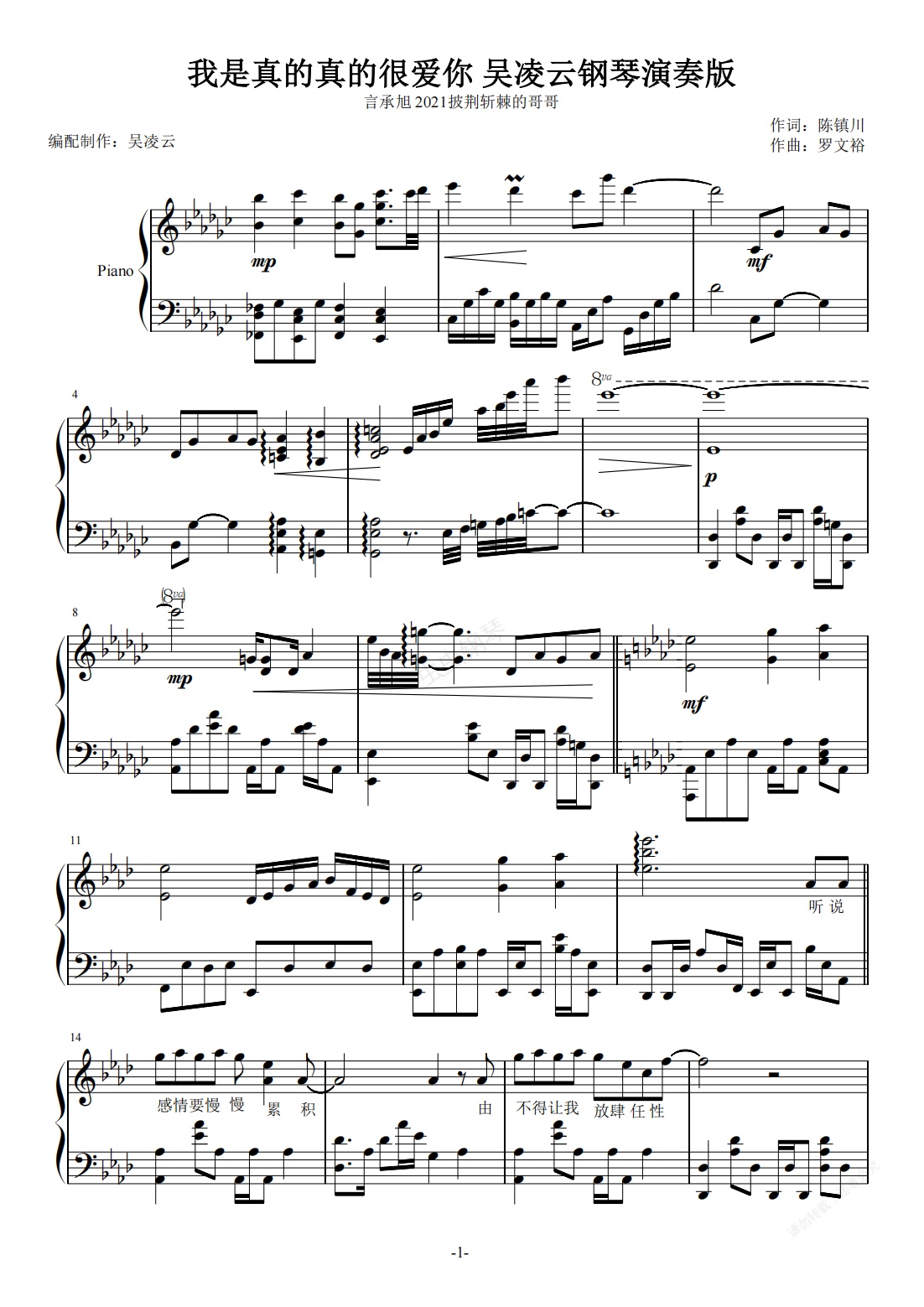 钢琴谱:我是真的真的很爱你 吴凌云钢琴完整演奏版附歌词 言承旭/2021披荆斩棘的哥哥 迎接光棍节的到来 怀旧爷青回