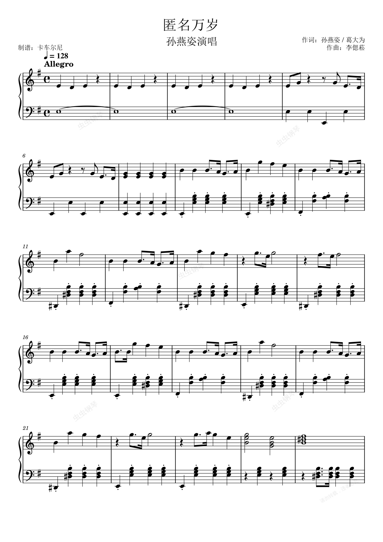 钢琴谱:孙燕姿演唱《匿名万岁》G调简易版