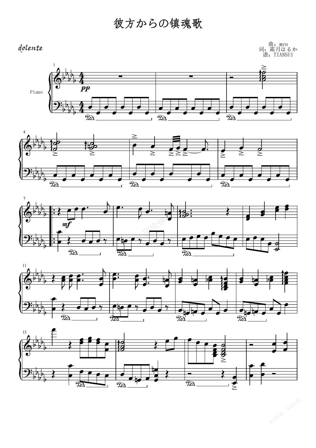 钢琴谱:【蔷薇少女】水银灯角色曲--彼方からの镇魂歌