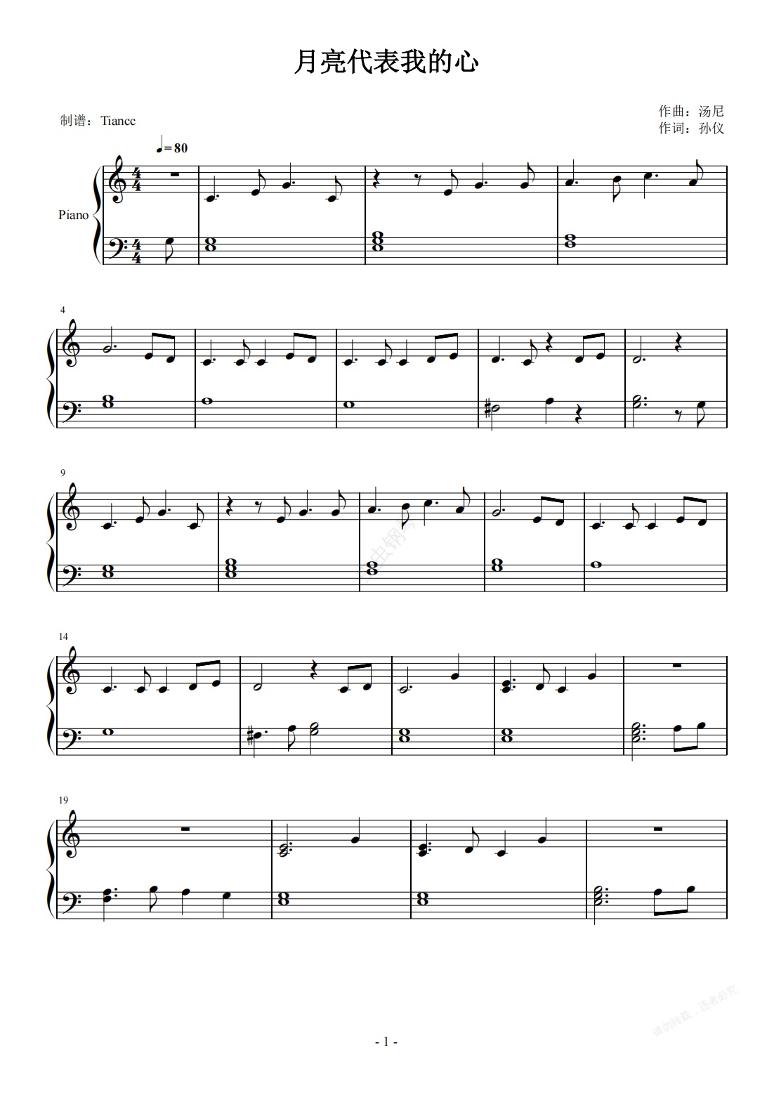 钢琴谱:《月亮代表我的心》教学专用,小汤2,3难度