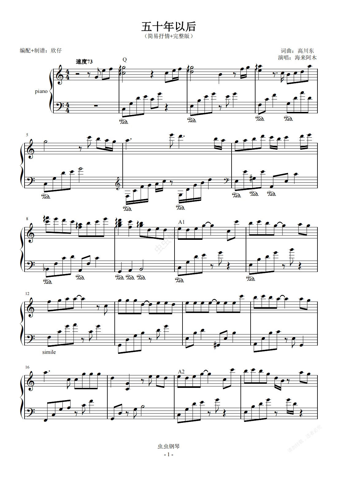 钢琴谱:海来阿木-C《五十年以后》(简化抒情+段落优化)