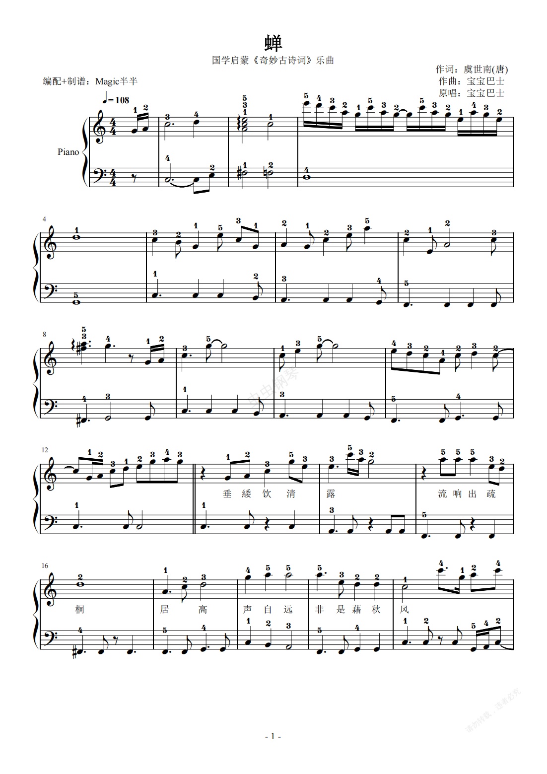 钢琴谱:奇妙古诗词/蝉(带指法)