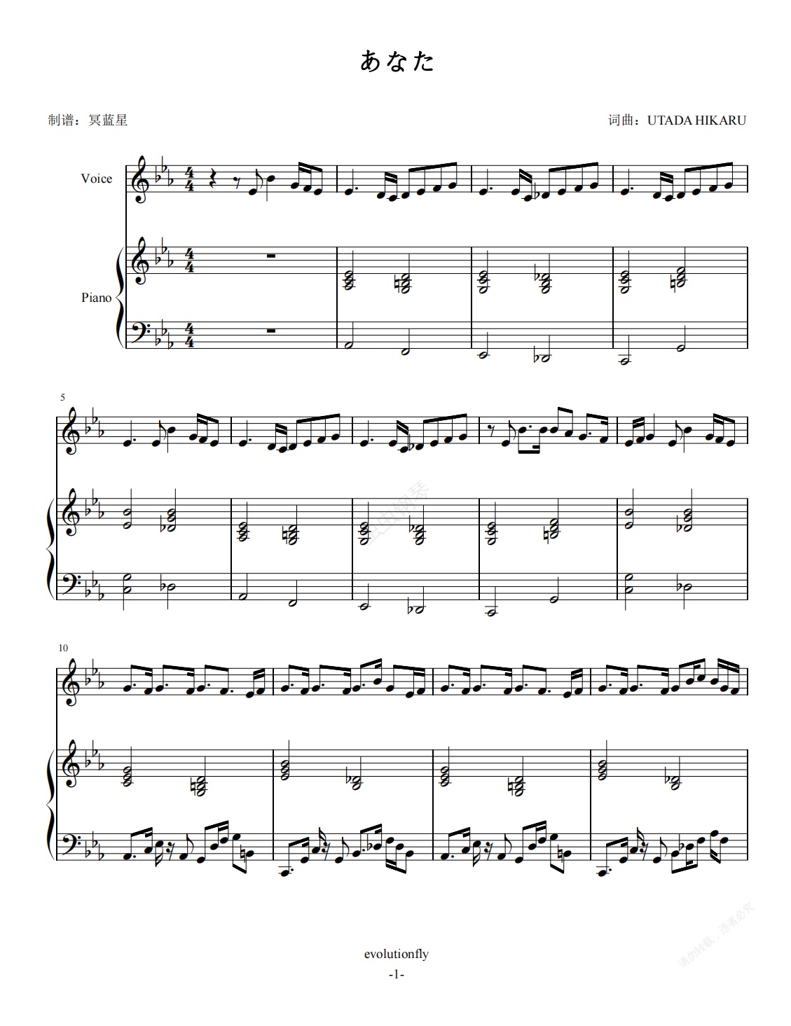 钢琴谱:あなた-宇多田光-伴奏谱