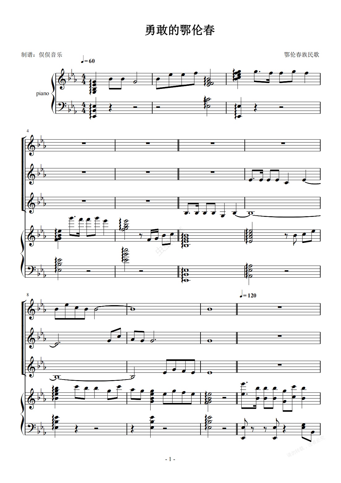 钢琴谱:勇敢的鄂伦春(三声部合唱伴奏谱)