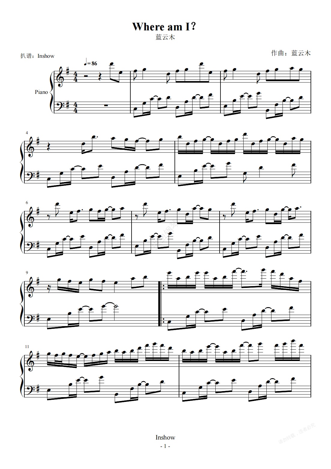 钢琴谱:Where am I?【独奏】- 蓝云木 -
