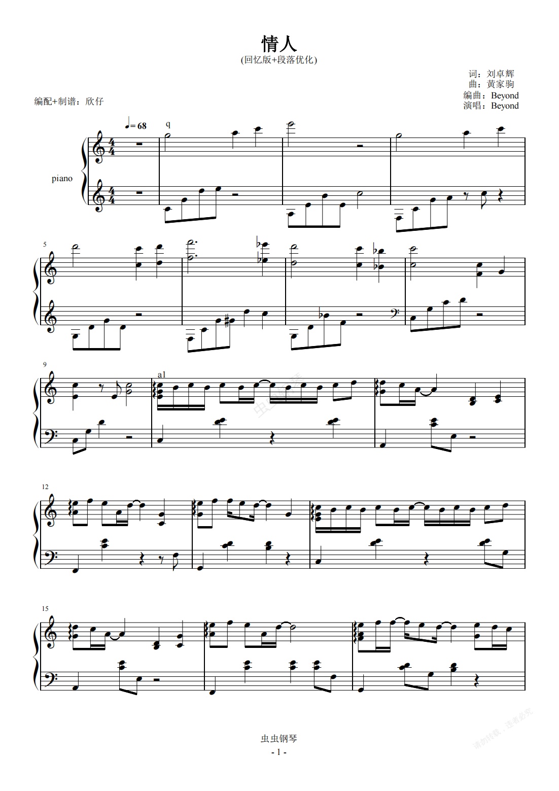 钢琴谱:Beyond-C《情人》(回忆版+段落优化)
