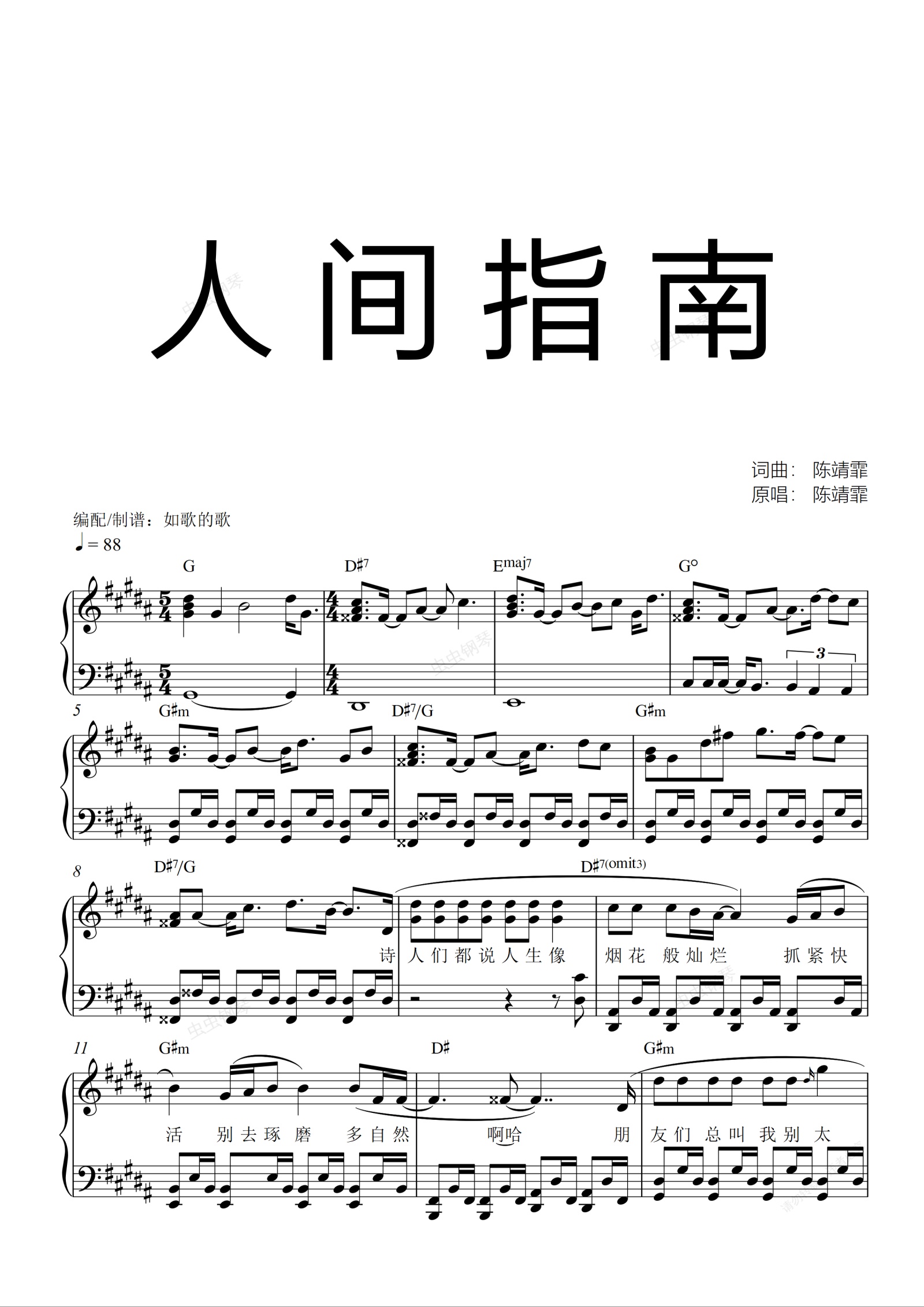 钢琴谱:人间指南-陈婧霏宝藏歌手(歌词&功能)