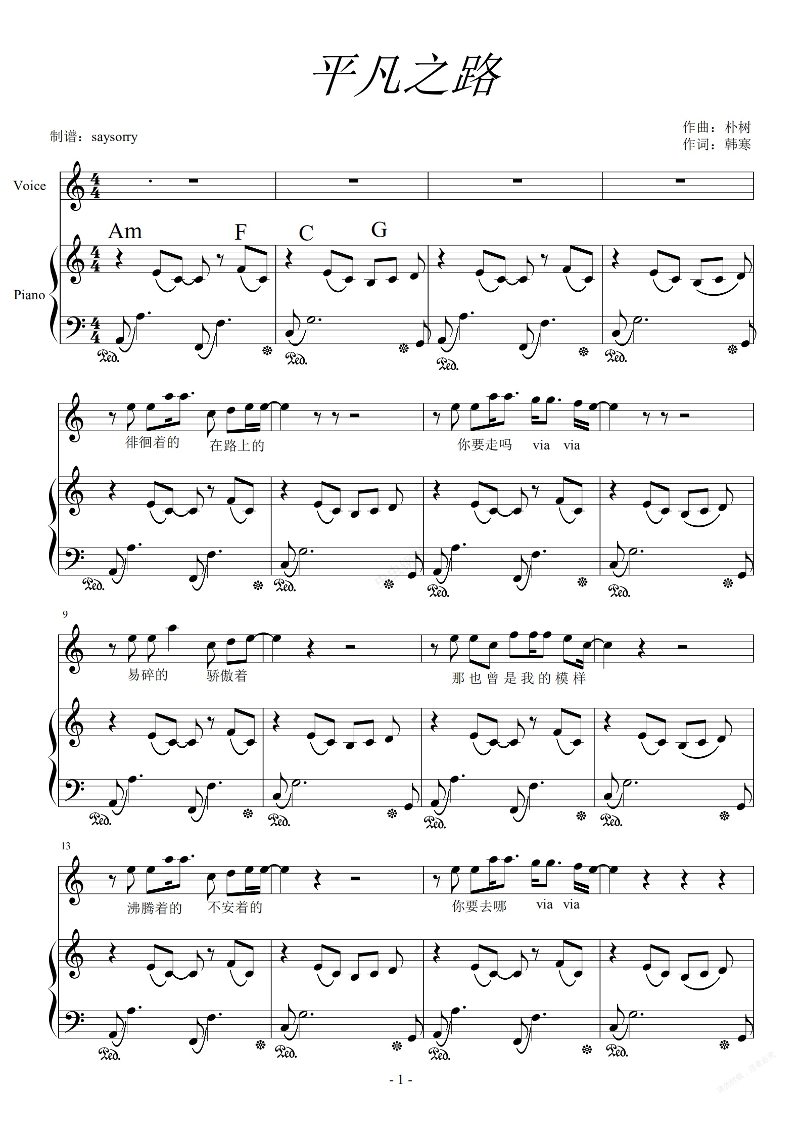 钢琴谱:平凡之路-弹唱-C大调-B站小晖老师的弹唱谱