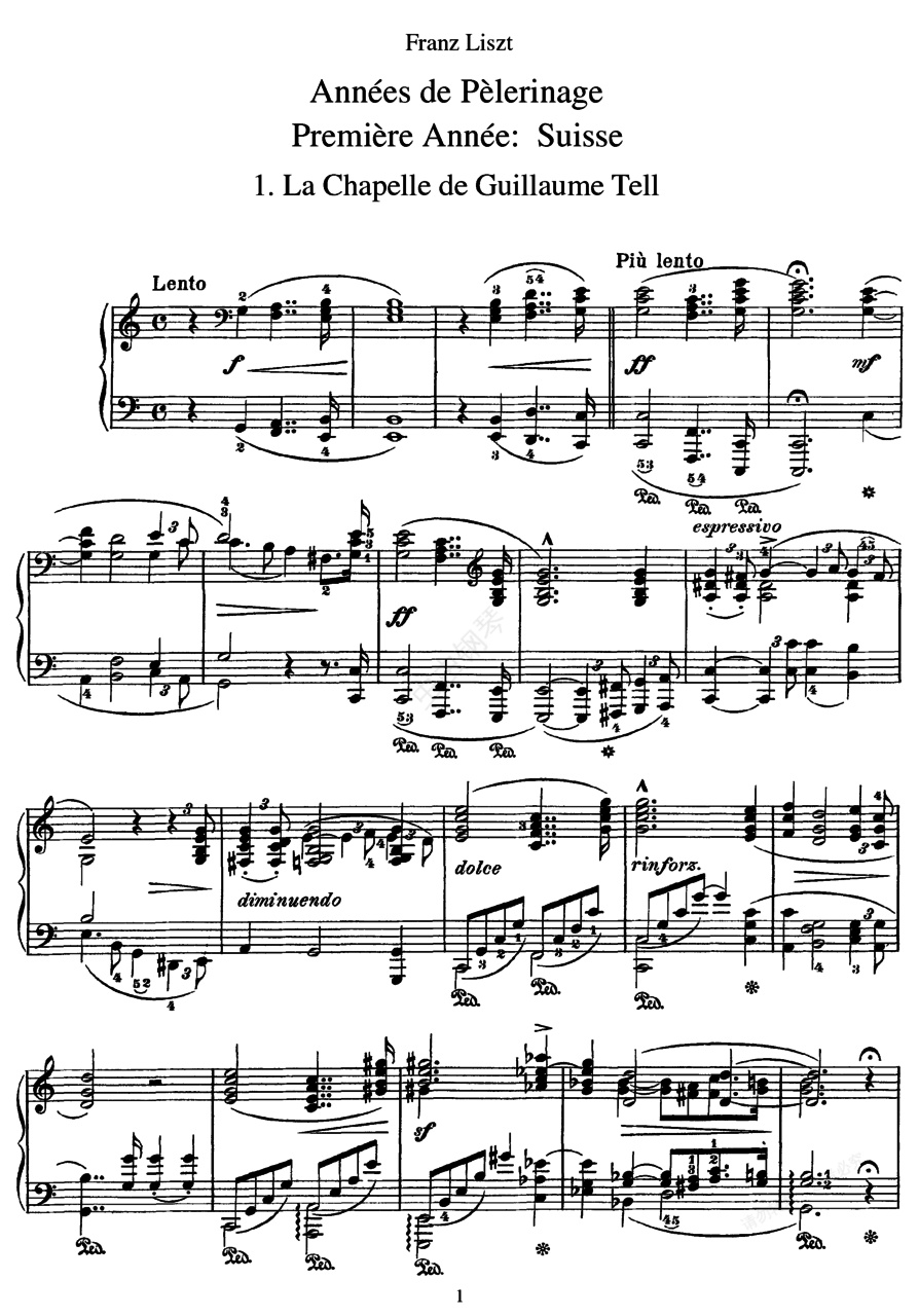旅行岁月(第一集)- 瑞士游记 Première Année, S.160 李斯特一生游历了许多国家,深受各国不同的自然风光、历史文化的触动,他把这些深切的感受和鲜活的印象用音符写入了他的作品中,其中最有名的就是他取名为《旅行岁月》Années de Pè 的三部钢琴曲集(又译“旅游岁月”)。 《旅行岁月(第一集)- 瑞士游记》Première Année, S.160 ,是于1848-1854年间,根据其1835-1836年所作的钢琴曲集《旅行者札记》Album d'un S.156 修改而成。同时在这次修改中,为了使人们不再演奏或传播修改前的作品,他于1850年从出版商哈斯林格出版社买回了《旅行者札记》S.156 的版权和印版,并不允许它在自己的作品总目录中出现。 这部《旅行岁月(第一集)- 瑞士游记》S.160 于1855年由朔特出版社首次出版发行。共由九首曲子组成: 1.威廉·退尔教堂 de Tell ,C大调,4/4拍,慢板,后半段为活泼的快板。威廉·退尔是十四世纪瑞士独立运动的传说性英雄,在席勒的戏剧中为知名人物。这是李斯特参观威廉·退尔教堂的体会。他用音乐描绘了这位勇士高大的形象,铿锵的和弦犹如纪念碑一般挺拔、壮丽,隐隐地还可以听见山峦间回响着的号角和激奋向前的奔腾的音型,最后以悲壮的颂歌结束。在这首曲子的乐谱上,写着一句格言: One for all All for one 李斯特从这里感受到了人类英雄的伟大使命。他始终对英雄人物抱有无限的崇敬,因此他一生中不仅有许多以英雄为主题的作品,而且他也在音乐中塑造了属于自己精神世界的英雄形象。 2.瓦伦城之湖 Au lac de ,降A大调,3/8拍,平静的行板。左手部分是涟漪般的音型,右手在高音区吟唱流畅舒展的旋律,明亮纯净的音响有如湖面水波闪烁的光影,安详而令人陶醉。李斯特在乐曲标题下引用了拜伦的诗句: 你这鲜艳明丽的湖啊, 与荒寂的天地一道, 用无声的语言向我宣召: 为了纯洁无暇的春天, 抛离大地上的一切忧愁和烦恼。 玛丽则在她的自传体小说里回忆道:“在瓦伦城湖边,我们坐了许久。弗朗兹(李斯特)在这儿为我写下了带有忧郁色彩的和声,湖水叹息似的音响和船桨的节奏韵律。听到这些,没有一次我不是泪水盈眶的。”这首作品的确有一种带人超凡脱俗的力量,尽管,它始终是安详的。 3.田园 ,E大调,12/8拍,活泼地。二段体形式,单纯而朴实。带有舞蹈性,轻快明朗,使人联想到古老的田园牧笛和舞蹈场面,这是牧人和仙女的游戏。 4.在泉水边 Au bord d’une ,降A大调,12/8拍,优雅的小快板。是由主题装饰而成的自由变奏曲。其中引用了席勒的诗句: 年轻的自然之神 在清凉的潺潺细语中 开始它的戏耍。 李斯特用活泼的音型模仿泉水的喷涌,在晶莹剔透的音响中,仿佛看到太阳底下闪烁着光芒的飞溅的水珠。 5.暴风雨 Orage ,c小调,2/2拍,甚快板。取自拜伦的杰作《夏尔德·哈洛尔德巡礼》Child’S 第三集中对瑞士狂风暴雨描写的意境。 6.奥伯曼山谷 Valee d’ ,e小调,4/4拍,甚慢板。《奥伯曼》(又译“奥勃曼”)是塞纳库尔( de, 1770-1846) 创作的书信体作品,记录了无神论兼禁欲主义者的作者二十年的内心世界,曾与歌德的《少年维特的烦恼》一起挑起19世纪前半叶欧洲的自杀风潮。这首小曲描述奥伯曼内心“我盼望什么?我是什么人?在自然里能寻找到什么?”李斯特在乐谱上引录了塞纳库尔的一大段文字: “巨大无边的自然意识,无处不在。它淹没一切,不可穿越。全人类的痛苦、冷漠、超群的智慧、耽于声色的自弃,所有的欲望和深深的烦恼,这一切由人的心灵所承受的,我都已经感觉到了,都承受过了,就在那值得纪念的夜晚。我迈着满是噩兆的步法走向衰弱的年龄;我已经吞下了我生命中整整的十年。” 李斯特在这首漫长的作品中,准备地把握了这段文字的意境。它是暗淡的、阴沉的。但是,乐曲最后是以乐观明朗的情绪结束的。李斯特天性中有这种乐观,他始终自认为是一个能够战胜困难、能够把握住自己命运的强者。他在爱情、大自然、艺术上的成就远远超越了他所受到的挫折。对他来说,塞纳库尔的深重苦难毕竟还是遥远的,或者,只是一种艺术。 7.牧歌 ,降A大调,4/4拍,稍快的小快板。灵感来自瑞士山间《牧牛之歌》的情绪。 8.乡愁 Le mai du Pays ,e小调,4/4拍,慢板。这首作品宛如前面第六首《奥伯曼山谷》的插曲,表现奥伯曼在巴黎对田园生活的乡愁,他曾对朋友们说:“我唯一死而无憾的葬身之地是阿尔卑斯山。” 9.日内瓦的钟声 Les de ,B大调,6/8拍,很快的小快板。这是李斯特题献给他的女儿布兰迪的一首小品。1835年12月18日,玛丽在美丽的日内瓦为李斯特生下一个女儿。生平第一次当父亲的李斯特,在平静的湖面荡漾的祈祷的钟声中,为女儿布兰迪的幸福而祷告。拜伦的诗句被题写在乐谱上: 我活着,但这不是我自己, 我是环绕着我的 一切之中的一部分。 这首作品是夜曲风格,总体是安详而宁静的,伴有类似钟声的音响,在中段有一个很强烈的高潮。可以体会到,李斯特对女儿出生这件事很有感触,一种对造物主的感恩之情与起到的意味盎然于优美的歌唱性旋律之中。