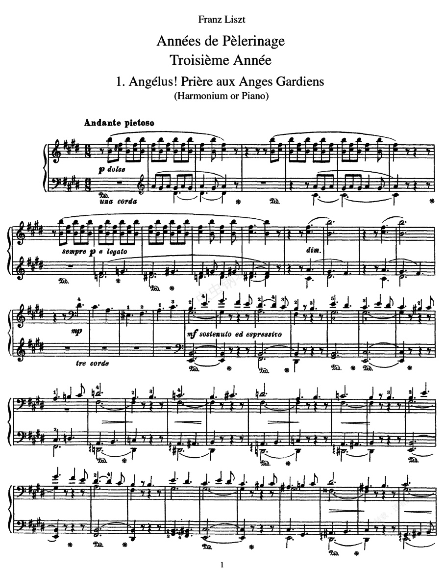 旅行岁月(第三集) Annee S.163 在完成前两集《旅行岁月》大约三十年后,李斯特再次执笔,写下第三集。《旅行岁月(第三集)》 Annee S.163 ,作于1867-1877年,无总标题,但后人常常称它为“罗马游记”,因为这部作品均写于这座迷人的城市。此时的李斯特年岁已高,心境亦发生了改变,因此这一集小曲显得很简朴,甚至可说是严肃,其中预示了印象派和二十世纪的音乐。三十年前的青春气息和满腔希望,此时已变作了深深的叹息。这个作品于1883年出版,共由七首小曲组成: 1.祈祷之钟声! aux Anges ,又译“感恩”、“天使颂”,E大调,6/8拍,虔诚的行板,于1877年为女儿科西玛与彪罗所生的儿子丹尼尔而作。这是一个饱尝了人生辛酸的老人发自内心的概叹。在第一集《瑞士游记》中,李斯特曾为他的刚出生女儿布兰迪写过一首洋溢着幸福和感恩心情的《日内瓦的钟声》,现在,来自罗马大大小小教堂的钟声整日回荡在耳边,可是布兰迪已经不在人世。百感交集的李斯特为外孙这个可爱的小生命咏诵起祝福的歌,但它不是欣喜的,仿佛笼罩着浓浓的阴云。乐曲的高潮部分既像是钟声的轰鸣,又像是内心忧愤的迸发,音响强烈而不和谐。最后,音乐回到了开始的朦胧而宁静的气氛中,钟声远远地消失在罗马上空。谱面上还标有“簧风琴” 字样,指出这作品亦可以使用簧风琴演奏。 2-3.艾斯特庄园的绿柏 de la Villa d’ESte ,第二、第三首使用了同一个标题,又名《悲歌》。作于1877年,回忆着庄园里高大葱郁的绿柏(据说是意大利最大的树),不过有人考证,第三首最初的灵感是来自罗马圣玛丽亚天使教堂的柏树林。音乐沉重而颇有些沉闷,几乎没有任何钢琴演技的炫耀,只有音响色彩的不断变换和组合。此时的李斯特是为自己的心灵而创作,让自己的感情以更加自由和自然的方式宣泄。在沉重的和弦式乐句中,几个抒情的段落格外突出,它们的音响明亮而纯净,如歌的旋律由清澈的琶音衬托着,仿佛是浓密树荫下的点点阳光,又像是对青春时光的追忆。不过总体情绪仍是伤感无奈的,这几个抒情段落亦未能帮助他摆脱沉重的心境。 4.艾斯特庄园的喷泉 Les jeux d’eaux Villa d’Este ,亦作于1877年,是整部曲集中的亮色集中点,它以闪烁的音型和明亮的和声、高音区清透的音色描绘了可爱的罗马喷泉:阳光下,水柱反射出耀眼的光彩,它们就像无数小精灵在快活地嬉戏。是德彪西和拉威尔的印象主义钢琴作品的先驱。在作品标题旁,李斯特还引用了《圣经》中“约翰福音”的一段: “我给他的水,将会成为从他心中涌流而出的泉,它将进入永恒的生命。” 5.悲歌 Sunt Verum ,标题含义为“泪水源于人类的苦难”,作于1872年,献给封·彪罗。这位以往的女婿此时已被李斯特的女儿科西玛抛弃,也许这是作为对彪罗的同情和安慰吧。标题下李斯特专门标注了“采用匈牙利调式”,还摘选了维吉尔《艾尼德》的一段诗句,其中提到了特洛伊的沦陷,李斯特用它来暗示1848-1849年的匈牙利独立战争,尽管人民失败了,但匈牙利光荣犹存。音乐建立在所谓的“匈牙利音阶”上,全曲气氛极其沉重悲痛,但中间有一段形成对比的亮色调,它在两端沉重色彩的包围中显得极其可贵和迷人。 6.葬礼进行曲 funèbre ,是本曲集创作最早的作品,作于1867年,为纪念墨西哥国王马克西姆一世的逝世而作。他是一位较开明的国王,但最终还是成为了政局的牺牲品。在这里情绪更加沉重,色调更加深浓,表现出一种无奈。 7.净心 Corda ,标题含义为“发扬你的爱心”,作于1877年,标题取自天主教弥撒仪式的开始,它仿佛是对自己的鼓励,音乐既端庄又热烈,但深深的悲哀仍不肯消散……