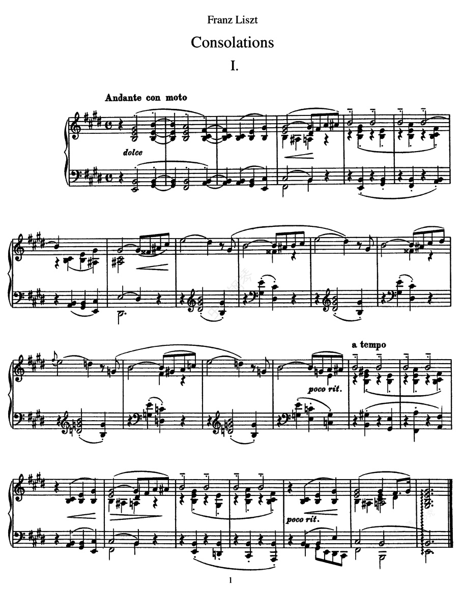 6首安慰曲 6 S.172 李斯特于1849-1850年所作的《六首安慰曲》6 S.172 跳脱了炫技的成份,走向内心的省视,它们都是非常精致的小品,是朴素动人,犹如歌曲一般的小品。 1. E大调,4/4拍,很快的行板。 2. E大调,4/4拍,稍微再快些。 3. 降D大调,4/4拍,平静的慢板。这首最为人所知,在纯净的琶音之上,有一条婉转的旋律。这种风格很容易使人联想到肖邦的“夜曲”,它带有冥想的以为,而没有一丝躁动。李斯特的这一类作品向人们展示的是他性格上的另一个侧面:超凡脱俗的、对彼岸世界的神往,和对至真至美的爱情的歌唱。 4. 降D大调,4/4拍,近似柔板的。 5. E大调,3/4拍,小行板。 6. E大调,3/8拍,始终保持如歌的小快板。