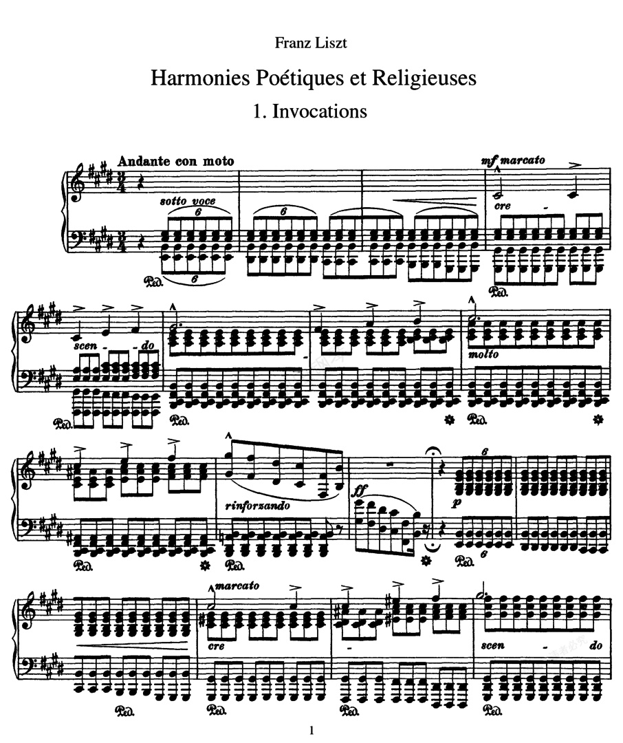 诗与宗教的和谐 et S.173 拉马丁,法国诗人,政治家。这位诗人比李斯特大21岁,他创作的《诗与宗教的和谐》、《沉思集》等诗篇中所流露的思想引起了刚遭受第一次失恋的李斯特的共鸣。拉马丁用优美的诗句来阐述这样的思想:人生是痛苦和失望的源泉,只有把理想寄托在对天堂的向往之中,或者是纯净的大自然中,才可能得到心灵的安宁。但李斯特和拉马丁的信仰又是有区别的。拉马丁的信仰是温柔甜美的,充满赞美与爱的,而李斯特的信仰却更多是赎罪的,苦修的(这与他父母有很大关系)。 拉马丁的“诗与宗教的和谐”,就是人与自然、于上帝奇妙造物之间的和谐。他在生活中处处看到上帝的显现,并为此由衷地歌唱。李斯特从这些诗歌中获得了深刻的启示,同时,他也被诗句中独有的音乐性所移动。他所创作的感触最深的一部作品就是《诗与宗教的和谐》,它激起了用音乐来阐述这种精神,来创造美的强烈欲望。几年以后他将一首钢琴作品也命名为《诗与宗教的和谐》 et S.154 (又译“宗教诗情曲”),并题献给拉马丁。这是一首很独特的作品,是真正内心的独白。与他那些炫技性的作品完全不同,他在其中找到了音乐与虔敬心灵之间的和谐,找到了人与大自然的共鸣。后来在1853年,李斯特出版的另一套同名钢琴曲集,其中包括了十首“宗教诗情曲”,并把原来的S.154 修订后收入其中,并更名为“死之冥想”Pensée des Morts 。 经过修订的《诗与宗教的和谐》 et S.173 ,作于1845-1852年,其中第二、五和第六首是根据李斯特自己创作的宗教声乐作品改编而成的,而第四首就是当年题献给拉马丁的《宗教诗情曲》S.154 的修订版。曲集于1853年出版,它们分别是: 1. 祈祷 ,E大调,3/4拍,甚快的行板。 2. 圣母玛丽亚 Ave Maria ,降B大调,4/4拍,中板。 3. 孤独中上帝的祝福 of God in ,升F大调,4/4拍,中板。 4. 死之冥想 Pensée des Morts ,G大调,3/4拍,柔板。即S.154 的修订版。 5. 神父 Pater ,C大调,3/4拍,行板。 6. 醒世歌 Hymn of a Child upon his ,降A大调,6/8拍,渐快的小快板。 7. 葬礼 ,f小调,4/4拍,柔板。 8. 主怜爱我 (after) ,e小调,广板,无节拍号。帕莱斯特里纳读后感。 9. 无标题,升g小调,4/4拍,哭泣般的行板。 10. 爱的赞美诗 Hymn of Love ,E大调,3/4拍,行板。