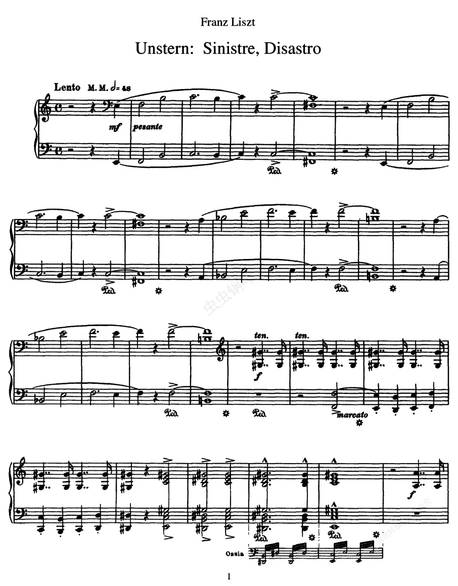 凶兆、灾难!, S.208 《凶兆、灾难》!, S.208 ,作于1880-1886年间,是李斯特生平创作的最后一首钢琴作品。4/4拍,慢板。其中充满了古怪而现代的音响。这充分体现了李斯特对生命的体验以及对人生意义的领会更为深刻,同时也暗示了李斯特对自身不久后即将离开人世的不详预感。在创作上,李斯特还在继续探索新的表现手法。这些比以往更深地闯入传统禁区的“不协和和弦”、“连续空五度”、“片断旋律动机”、“全音阶”、“五声音阶”,以及一些说不上是什么的奇异调式,充分论证了李斯特所说的一句话:“我的音乐是投向未来的长矛”。