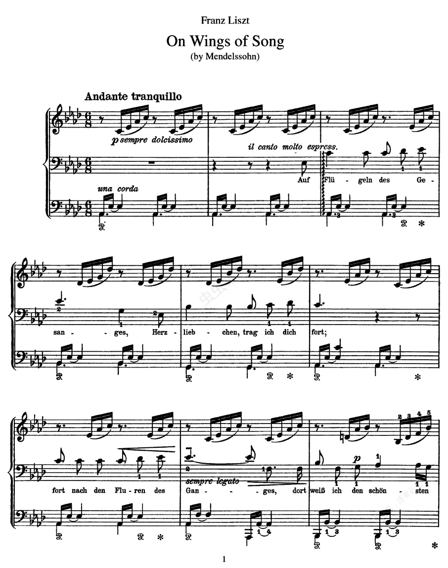 乘着歌声的翅膀 Auf Flügeln des Op.34-2 - 艺术歌曲    门德尔松最著名的一首艺术歌曲《乘着歌声的翅膀》On Wings of Song Op.34-2 ,作于1835年10月1日。当时门德尔松在杜塞尔多夫担任指挥,并完成了他的这部《六首歌曲》Six Songs Op.34。这首歌的歌词是海涅( Heine, 1797-1856) 的一首同名抒情诗《乘着歌声的翅膀》Auf Flügeln des 。全曲以清畅的旋律和由分解和弦构成的柔美的伴奏,描绘了一幅温馨而富有浪漫主义色彩的图景--乘着歌声的翅膀,跟亲爱的人一起前往恒河岸旁,在开满红花、玉莲、玫瑰、紫罗兰的宁静月夜,听着远处圣河发出的潺潺涛声,在椰林中饱享爱的欢悦、憧憬幸福的梦……曲中不时出现的下行大跳音程,生动地渲染了这美丽动人的情景。         歌词如下:    乘着歌声的翅膀  心爱的人,我带你飞翔  向着恒河的原野  那里有最美的地方    一座红花盛开的花园  笼罩着寂静的月光  莲花在那儿等待  它们亲密的姑娘    紫罗兰轻笑调情  抬头向星星仰望  玫瑰花把芬芳的童话  偷偷地在耳边谈讲    跳过来暗地里倾听  是善良聪颖的羚羊  在远方喧腾着  圣洁的河水的波浪    我们要在那里躺下  在那棕榈树的下边  吸饮爱情和寂静  沉入幸福的梦幻      李斯特将其改编成钢琴独奏曲,选调为降A大调,6/8拍,平静的行板。宁静的分解和弦伴奏由双手共同完成,在高音区与低音区紧紧地拥抱着甜美朴实的中音区旋律。
