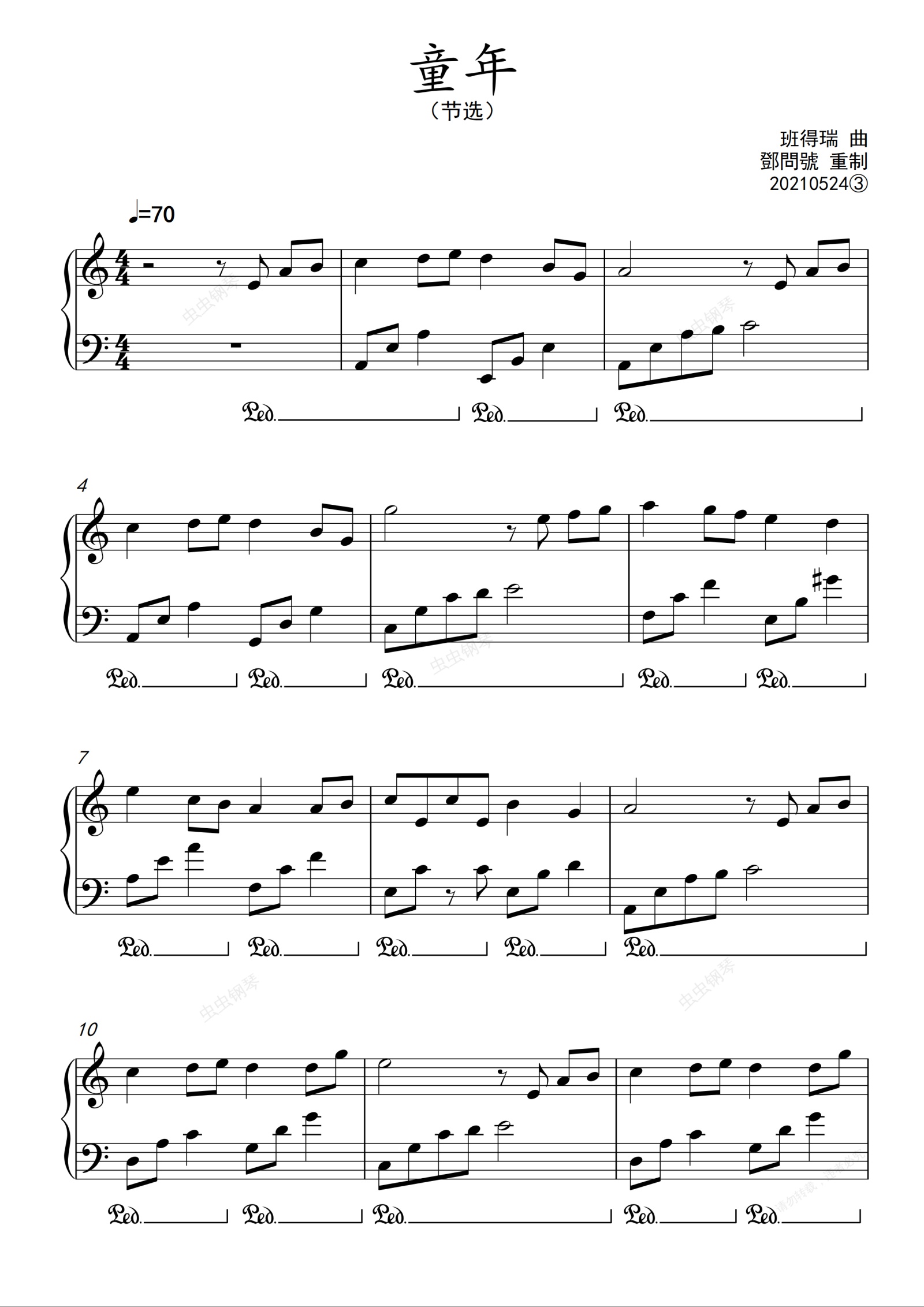 钢琴谱:班得瑞《童年》a小调节选简化版