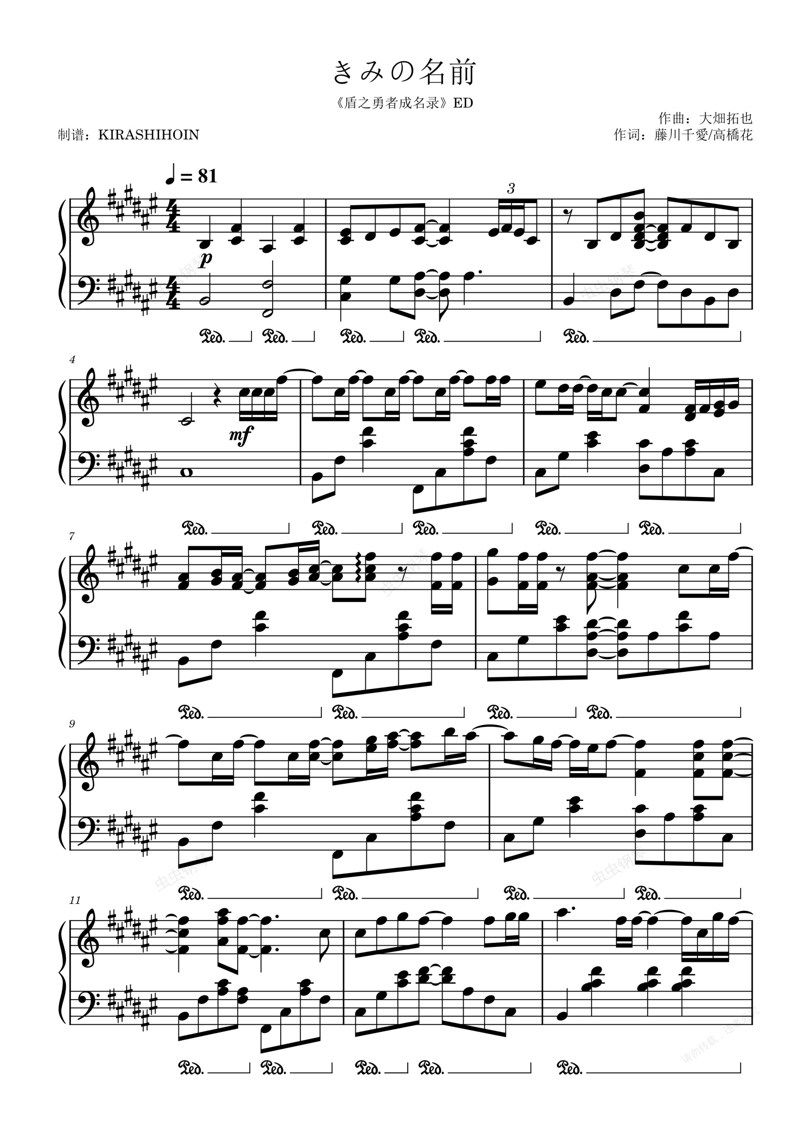 钢琴谱:きみの名前(《盾之勇者成名录》ED/片尾曲)- 藤川千愛