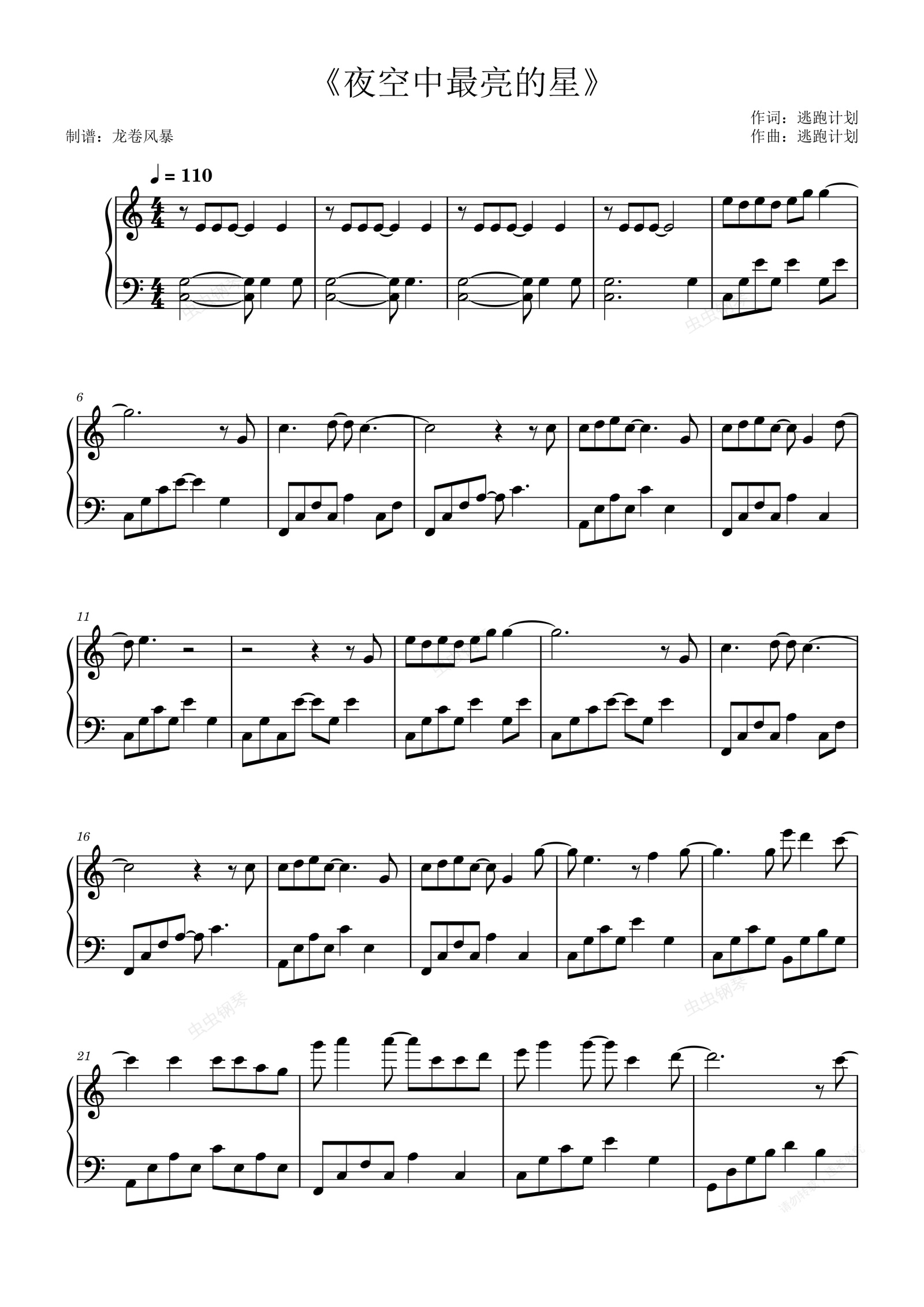 钢琴谱:《夜空中最亮的星》逃跑计划(Escape Plan)(C调简约版)