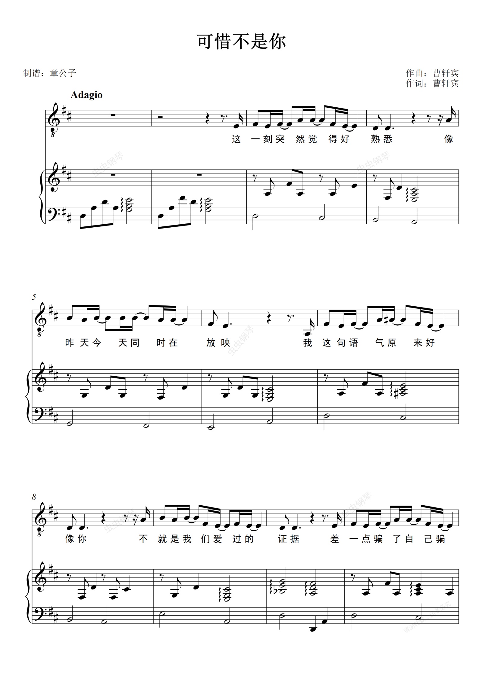 钢琴谱:《可惜不是你》(曹轩宾)D调弹唱谱 3分钟精简版