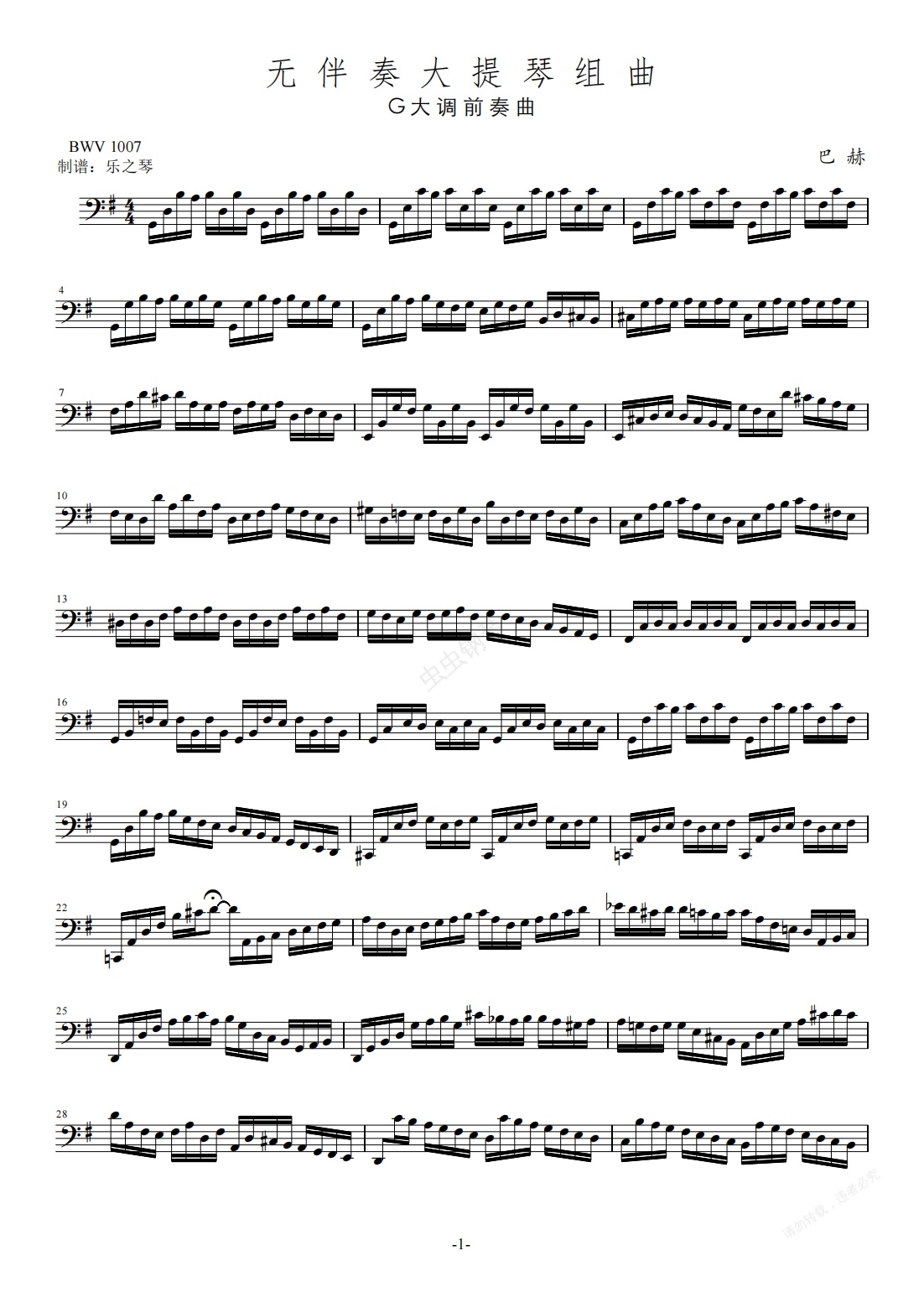 钢琴谱:无伴奏大提琴组曲-G大调前奏曲