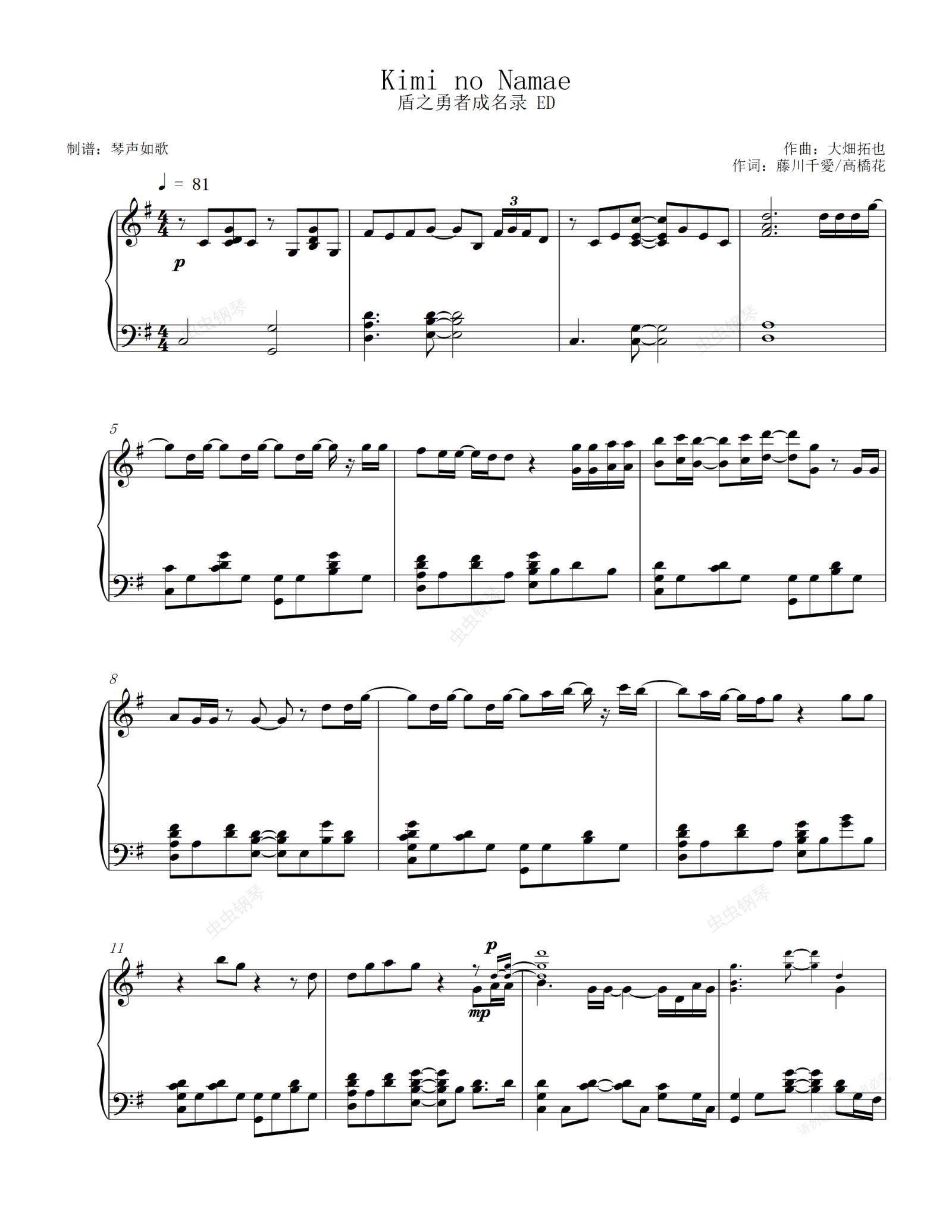 钢琴谱:盾之勇者成名录ED 你的名字「きみの名前」