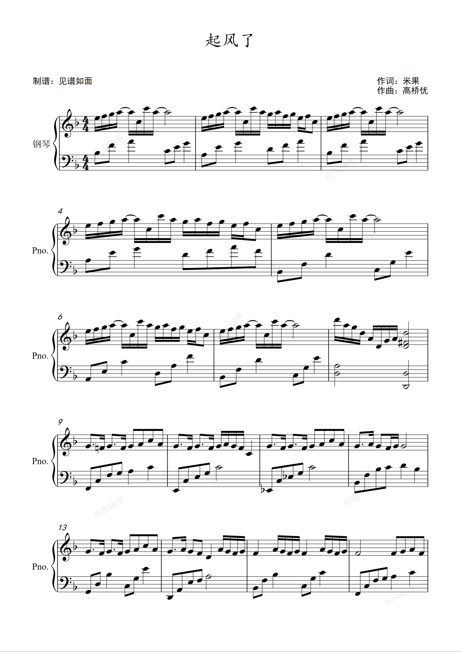 钢琴谱:起风了 - 买辣椒也用券【F调初级】