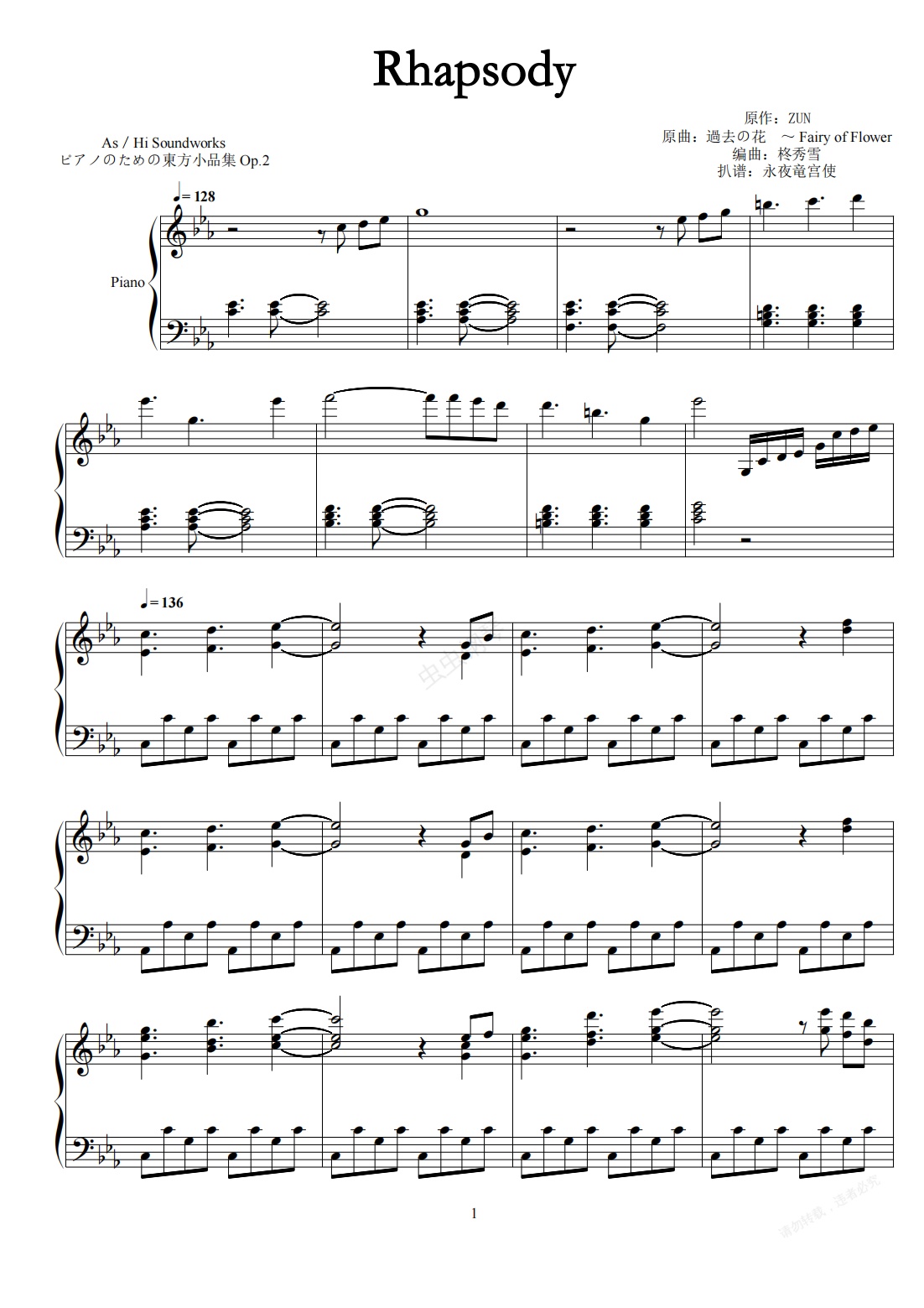 钢琴谱:【东方】Rhapsody 過去の花 ~ Fairy of Flower (柊秀雪)