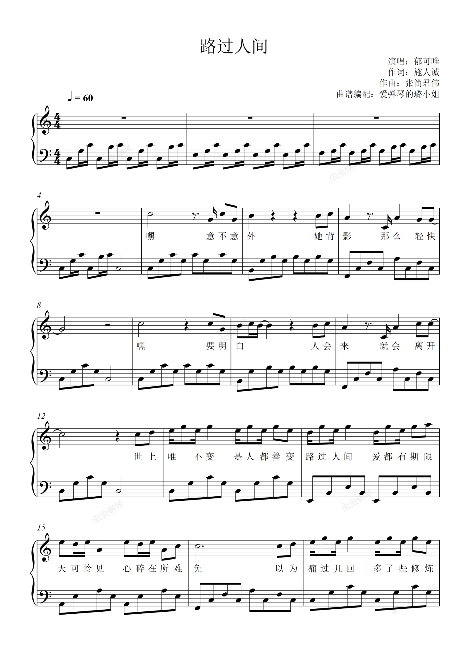 钢琴谱:路过人间 - 抖音热歌 - C调简单易上手 - 无删减前奏间奏歌词