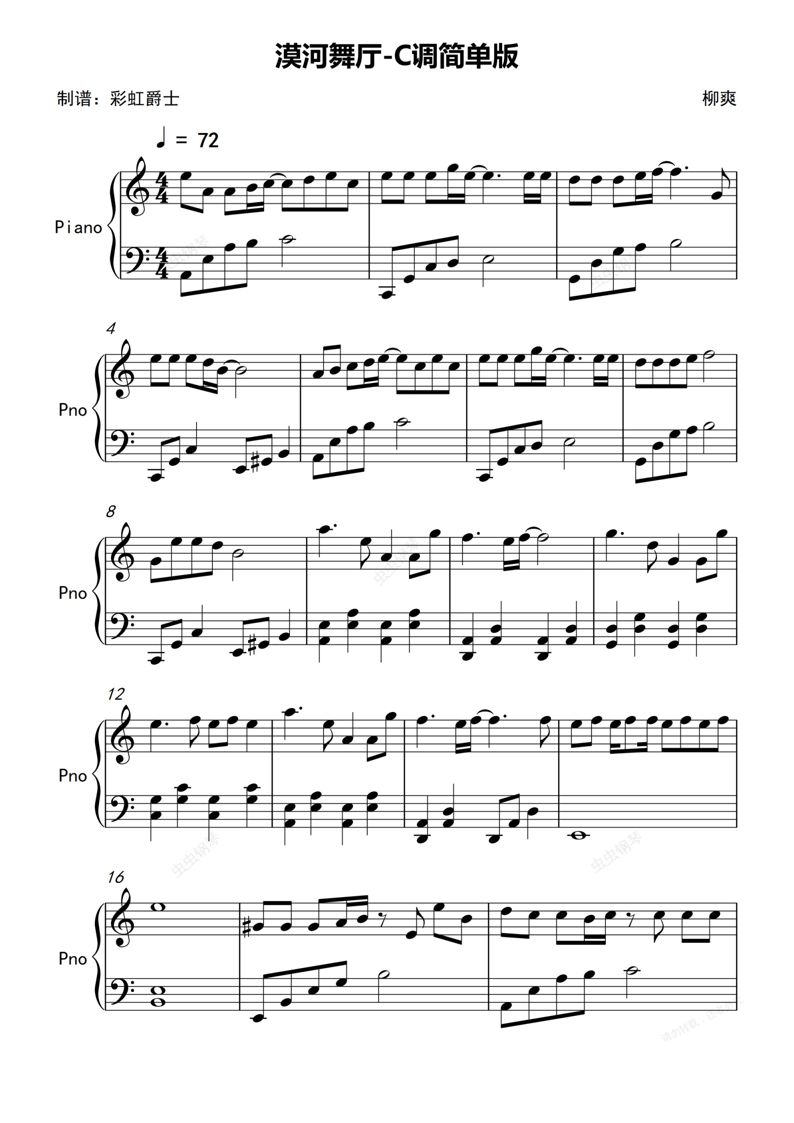 钢琴谱:漠河舞厅 C调简单版 柳爽 抖音