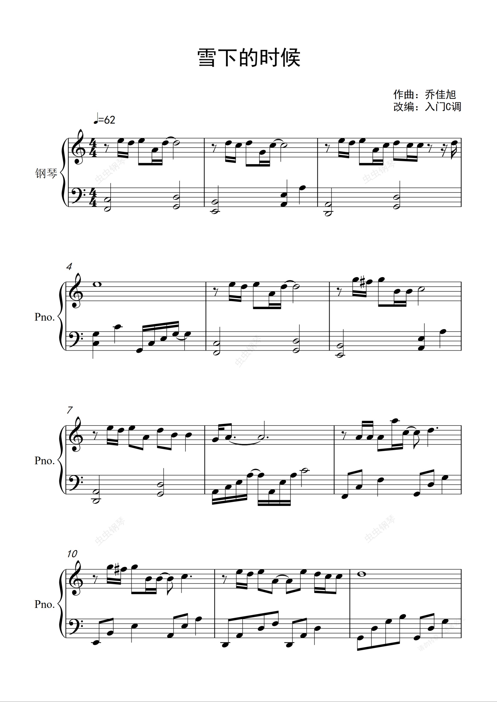 钢琴谱:乔佳旭《雪下的时候》入门C调简单版