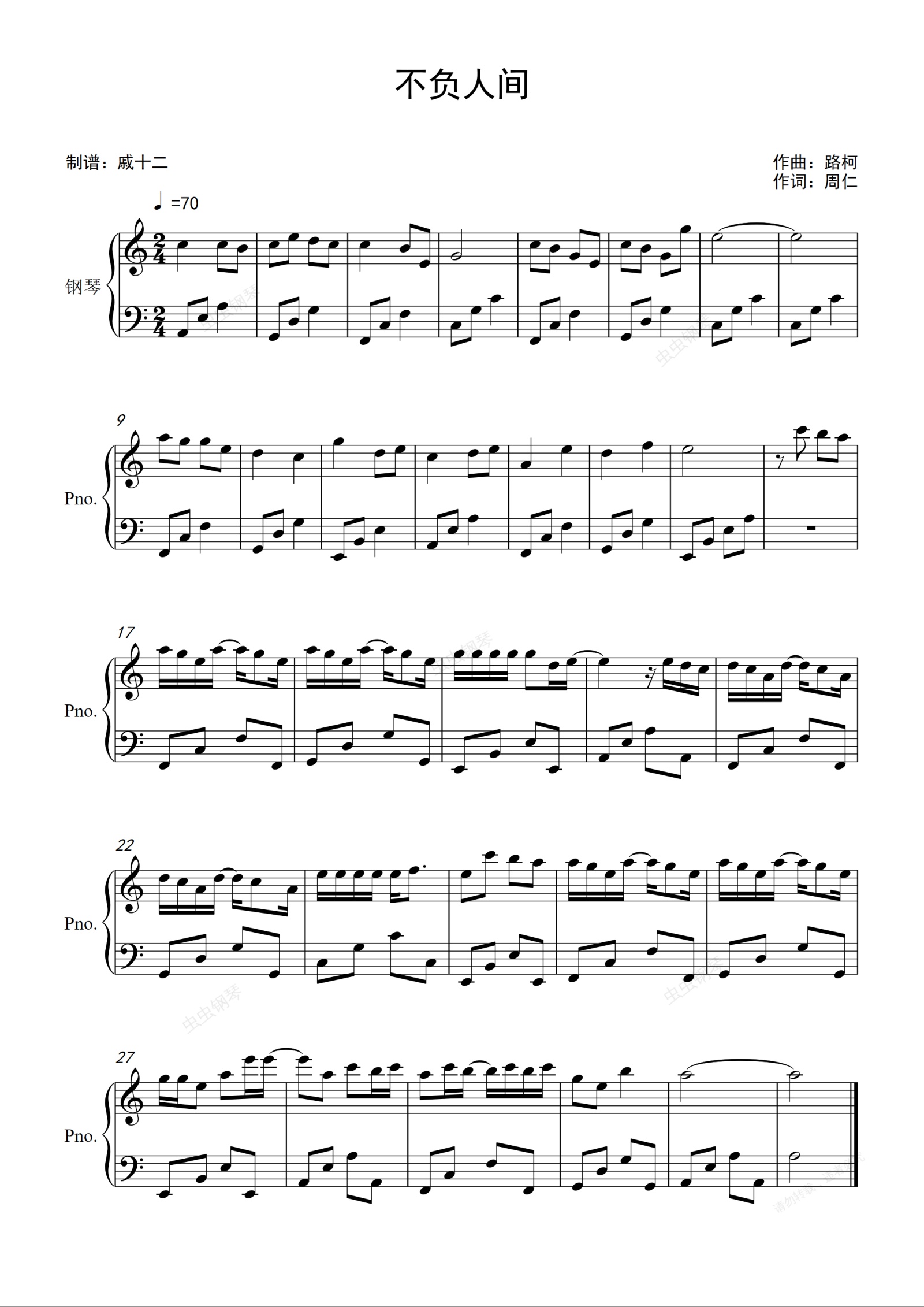 钢琴谱:不负人间-C调简单版