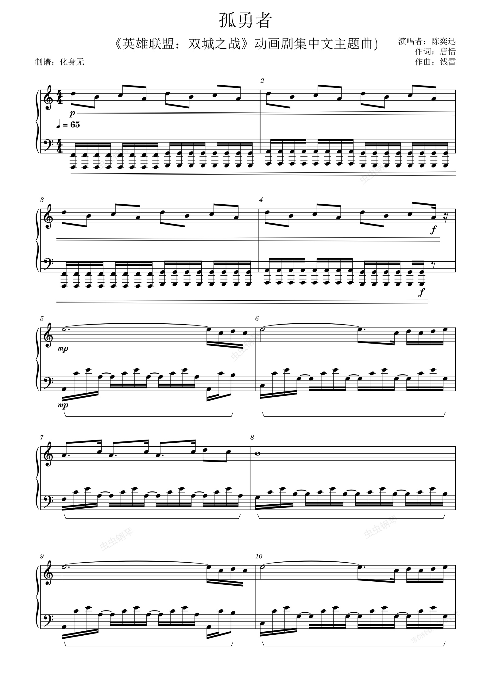 钢琴谱:孤勇者 C调版 《英雄联盟:双城之战》 动画剧集中文主题曲 陈奕迅