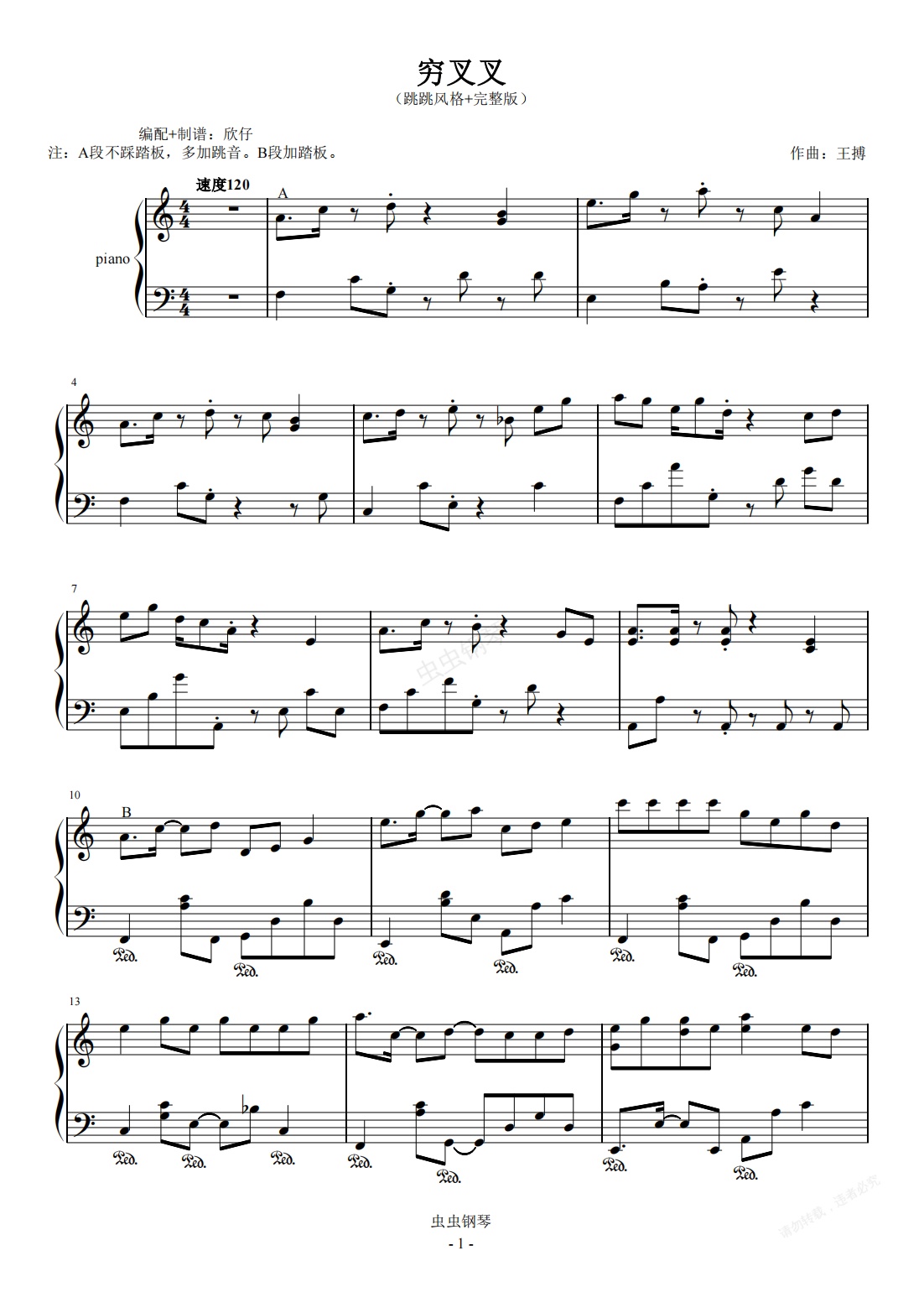 钢琴谱:抖音热播-C-《穷叉叉》(跳跳风格+完整版)