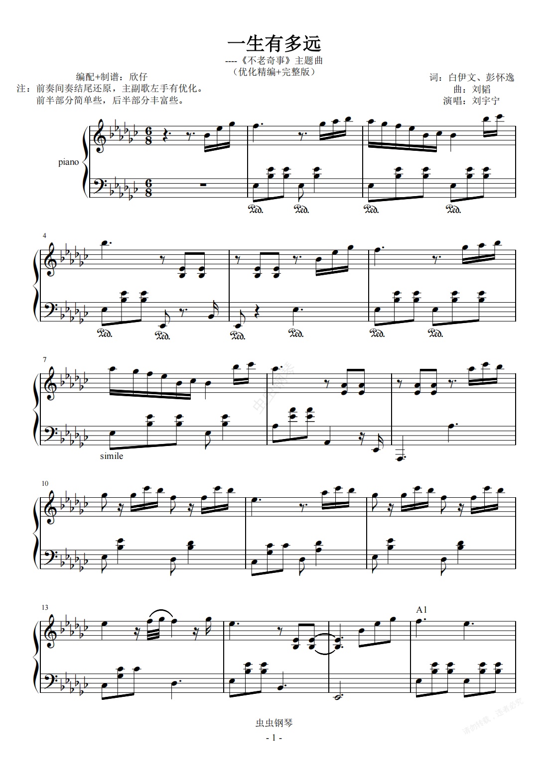 钢琴谱:刘宇宁-降G《一生有多远》(《不老奇事》主题曲、精编优化+完整版)