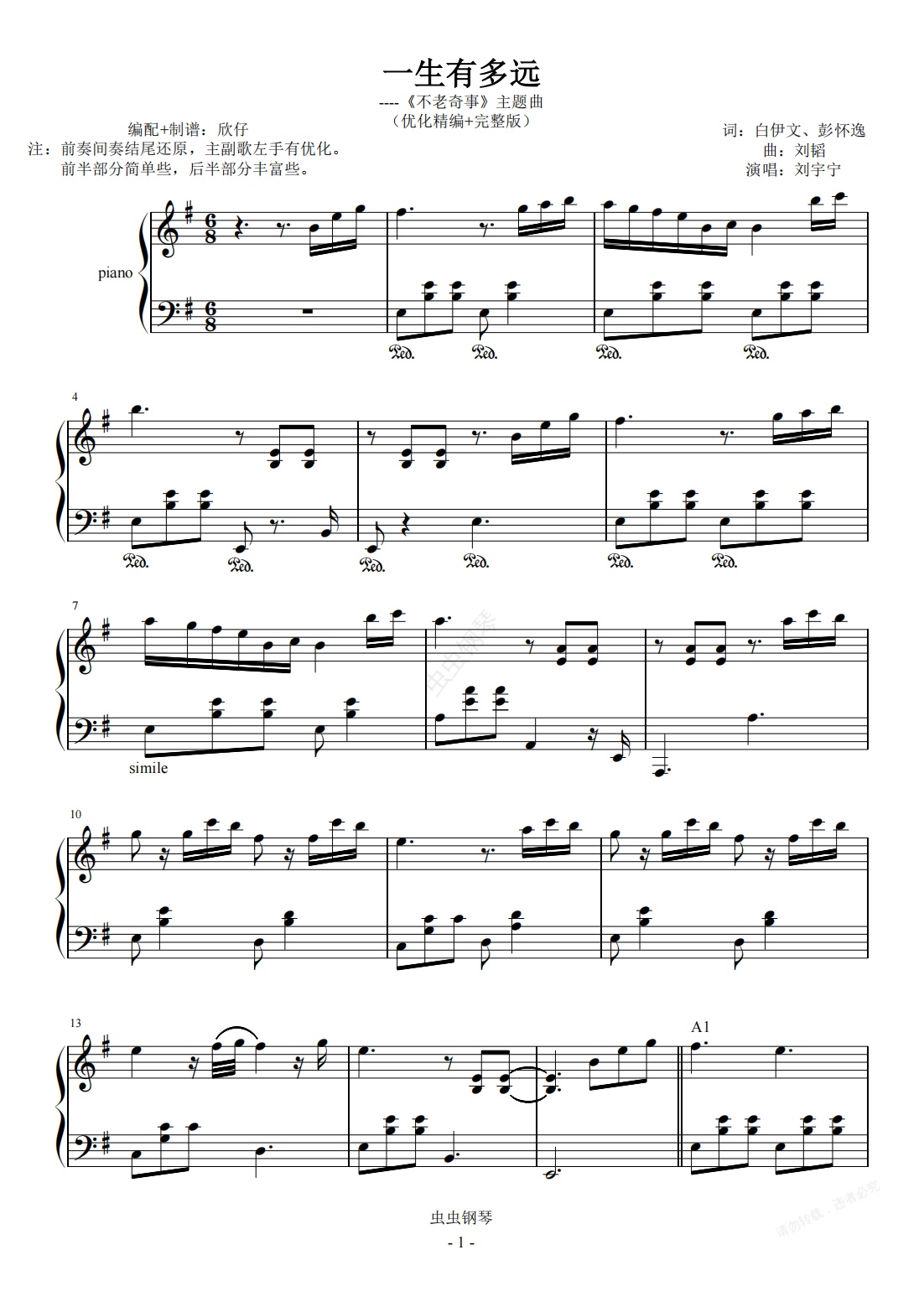 钢琴谱:刘宇宁-G《一生有多远》(《不老奇事》主题曲、精编优化+完整版)