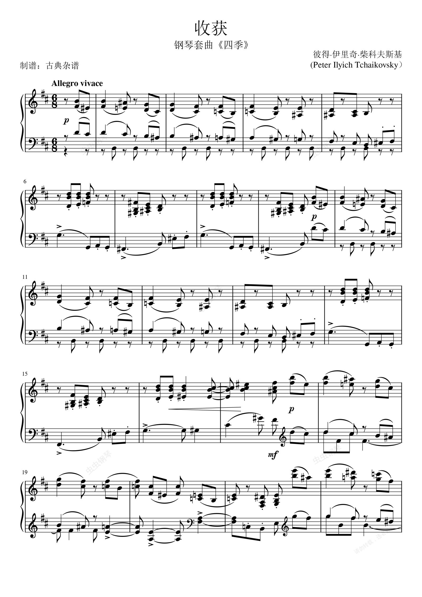 钢琴谱:八月-收获 柴科夫斯基,钢琴套曲《四季》