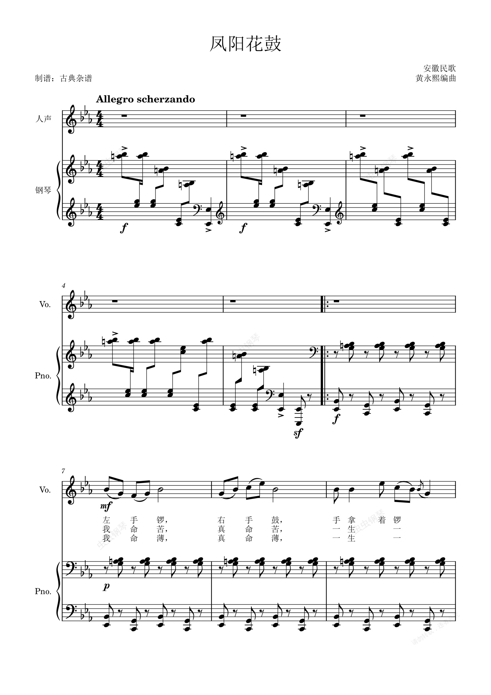 钢琴谱:凤阳花鼓【声乐伴奏谱】安徽民歌 黄永熙编曲