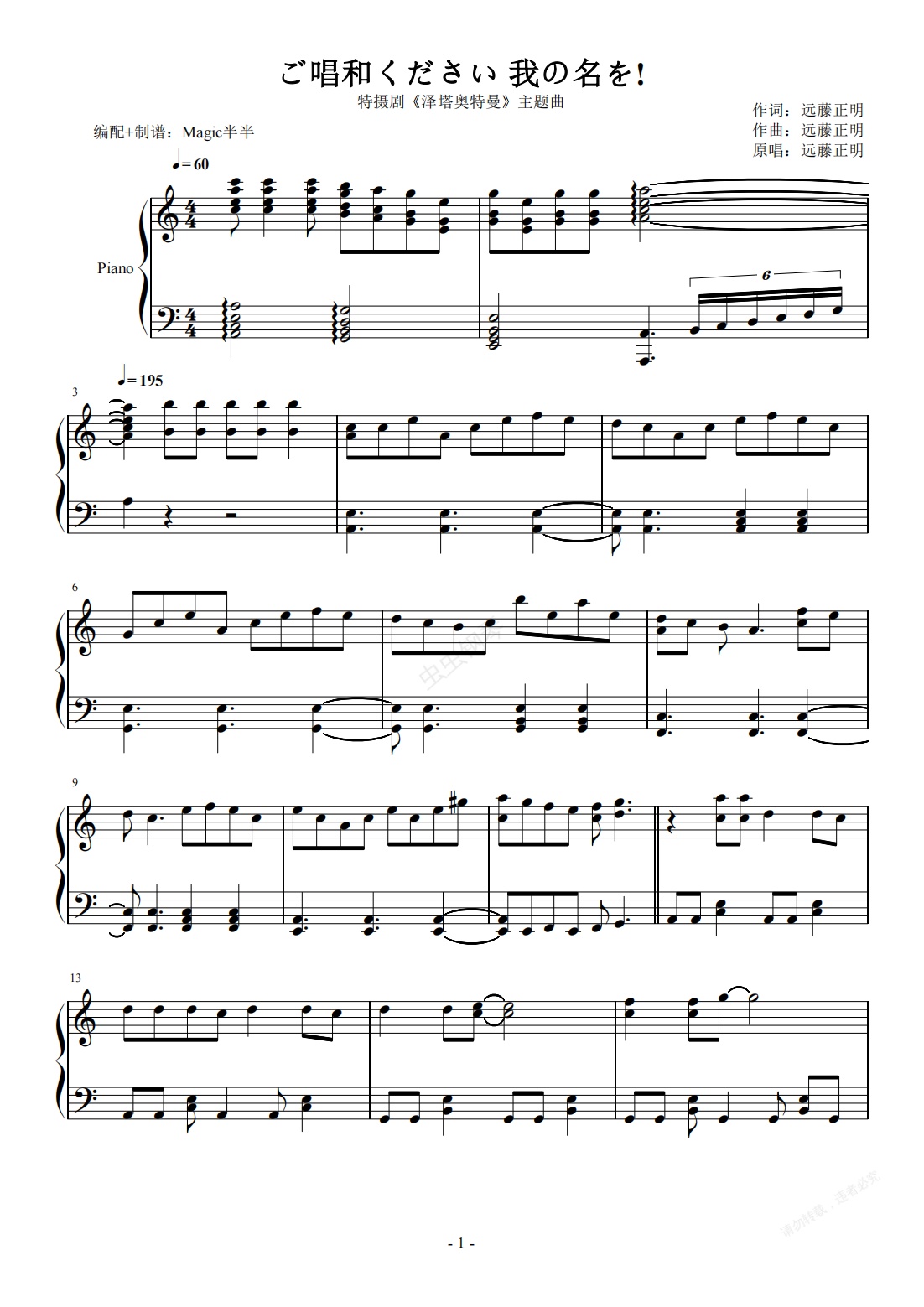 钢琴谱:泽塔奥特曼(主题曲)完整版