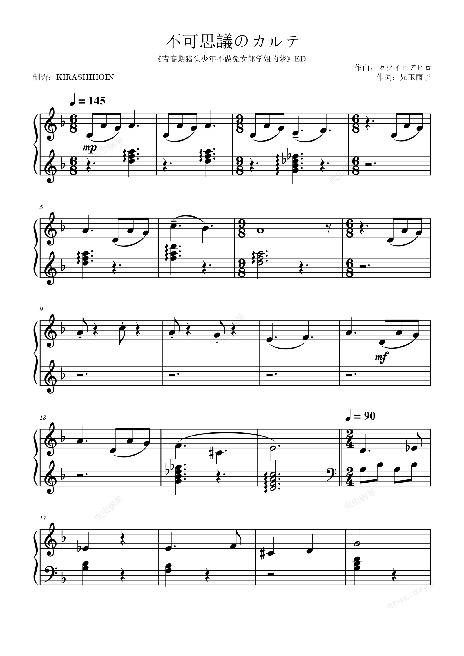 钢琴谱:不可思议的病例/不可思議のカルテ(《青春期猪头少年不做兔女郎学姐的梦/青春期猪头少年不做怀梦少女的梦》ED/片尾曲)