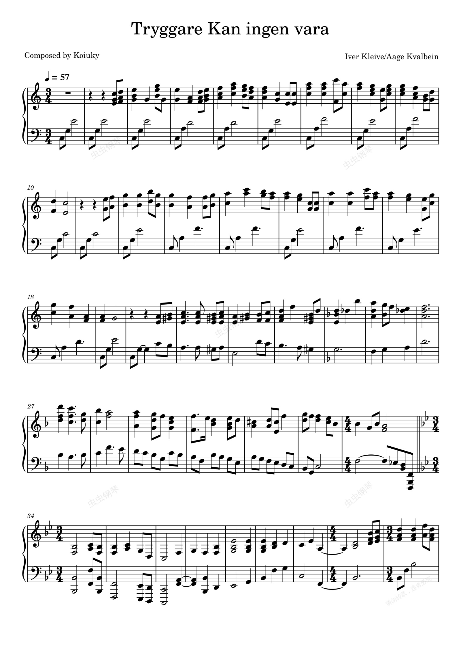 钢琴谱:Tryggare Kan ingen vara 钢琴谱
