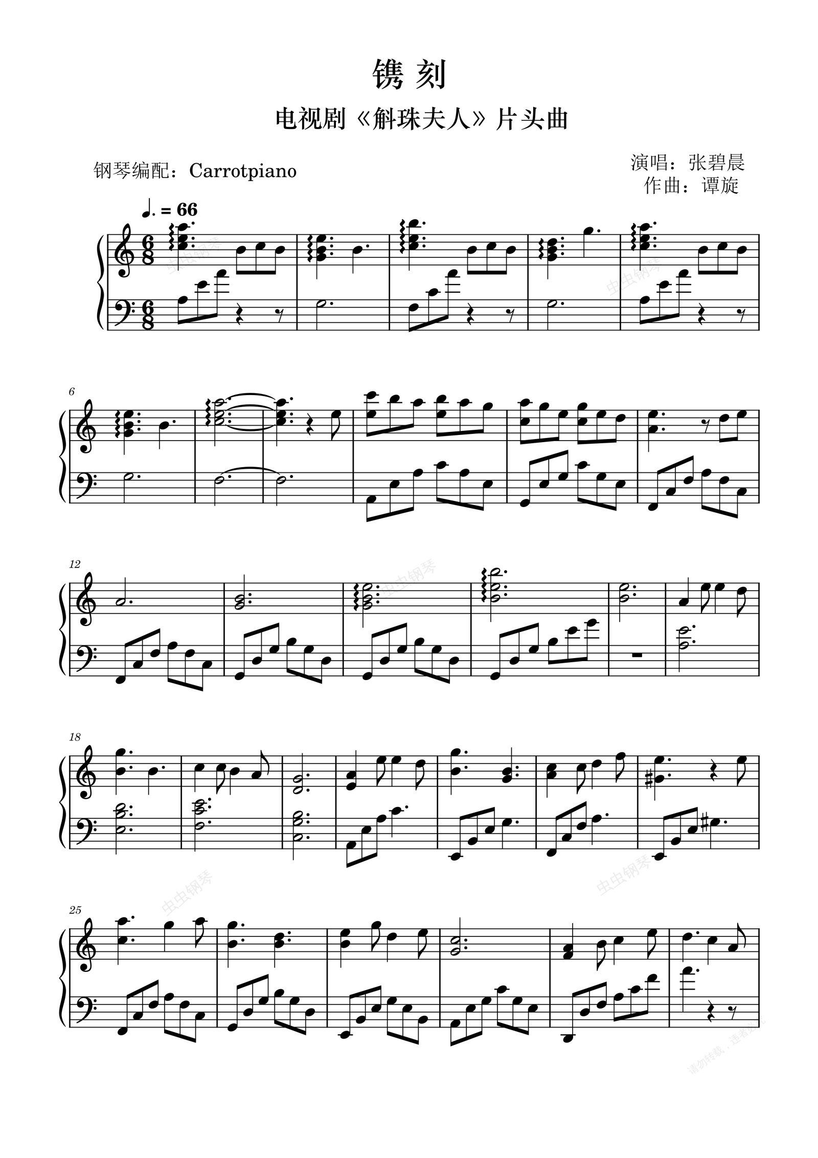 钢琴谱:张碧晨 - 镌刻 C调简易版 ( 斛珠夫人 片头曲 )