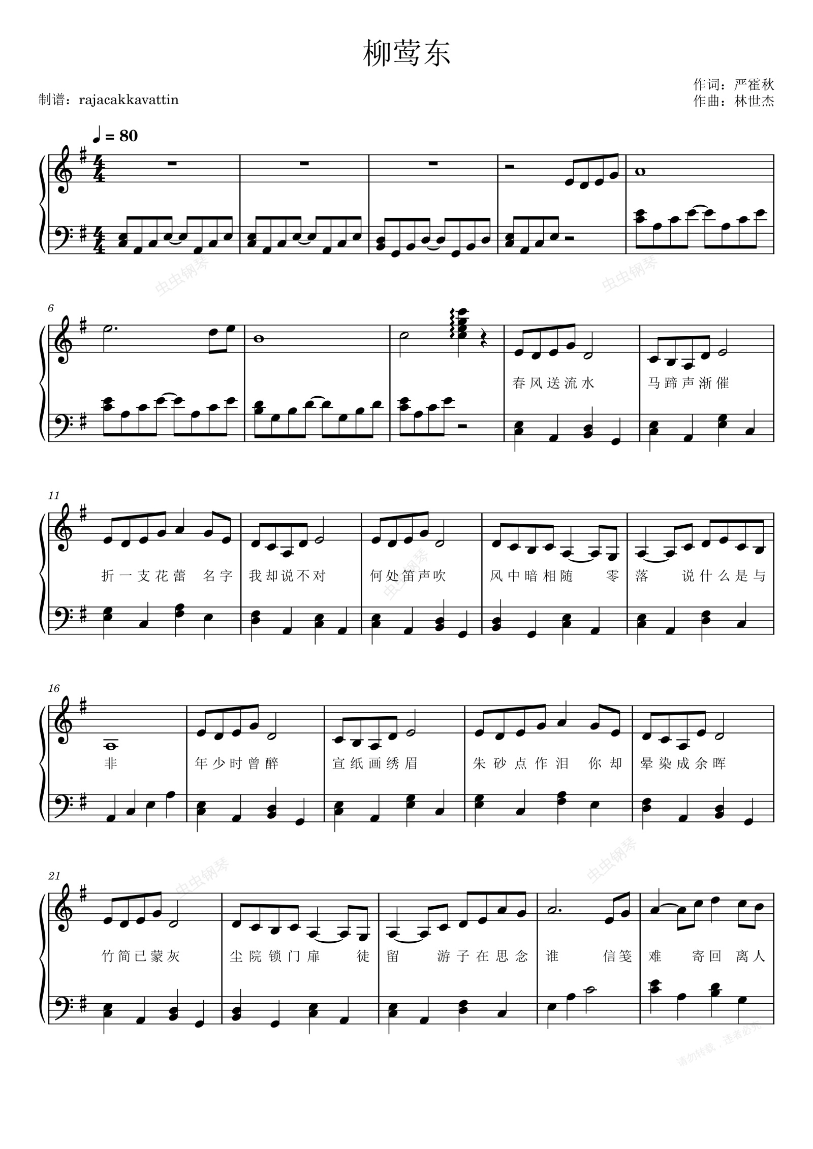 钢琴谱:柳莺东-含歌词版钢琴谱