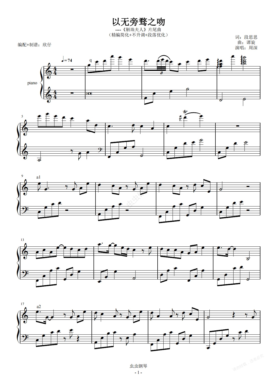 钢琴谱:周深-C不升调《以无旁骛之吻》(《斛珠夫人》片尾曲、简化+段落优化)