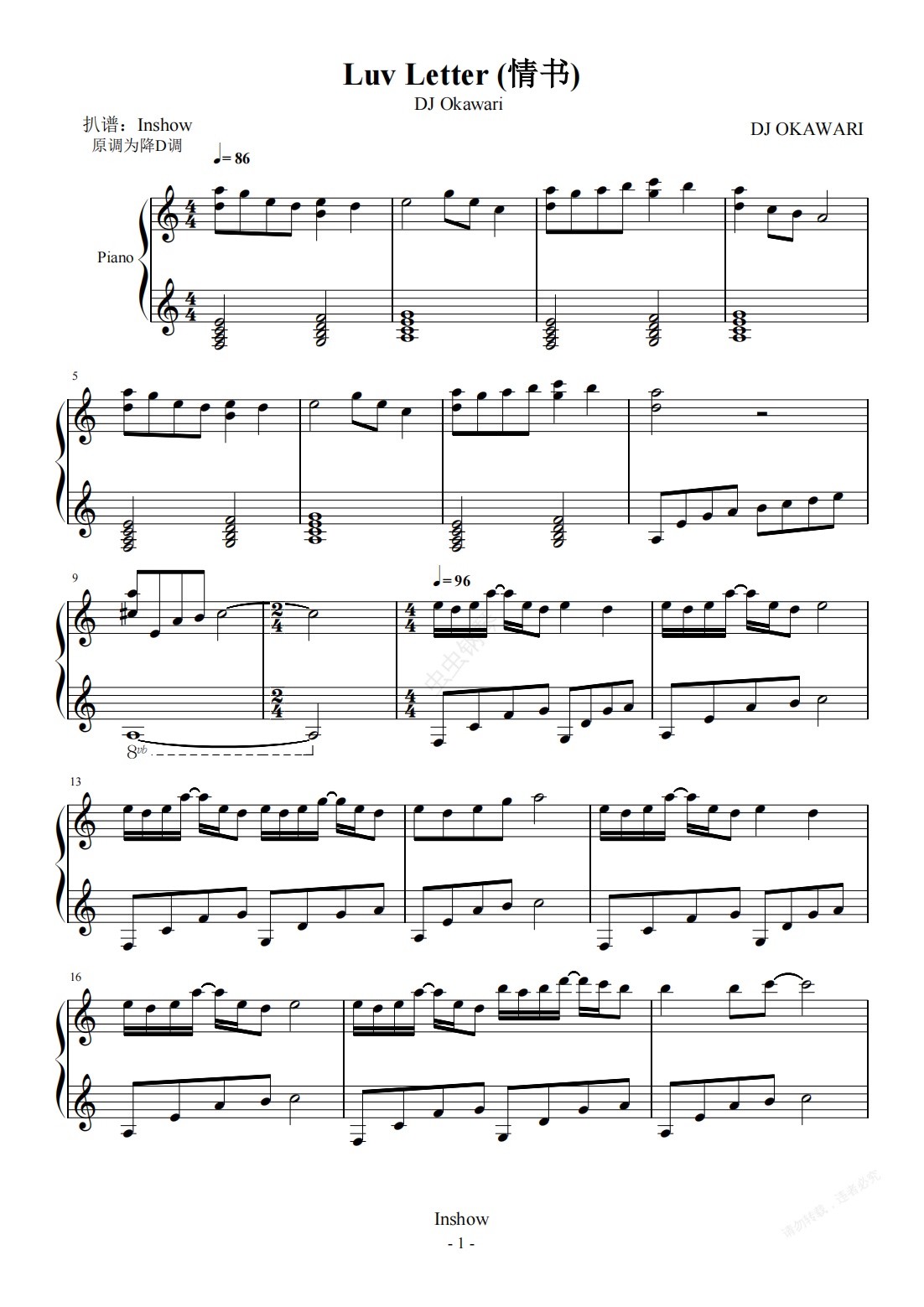 钢琴谱:Luv Letter (情书)【C调完整版】- DJ Okawari -