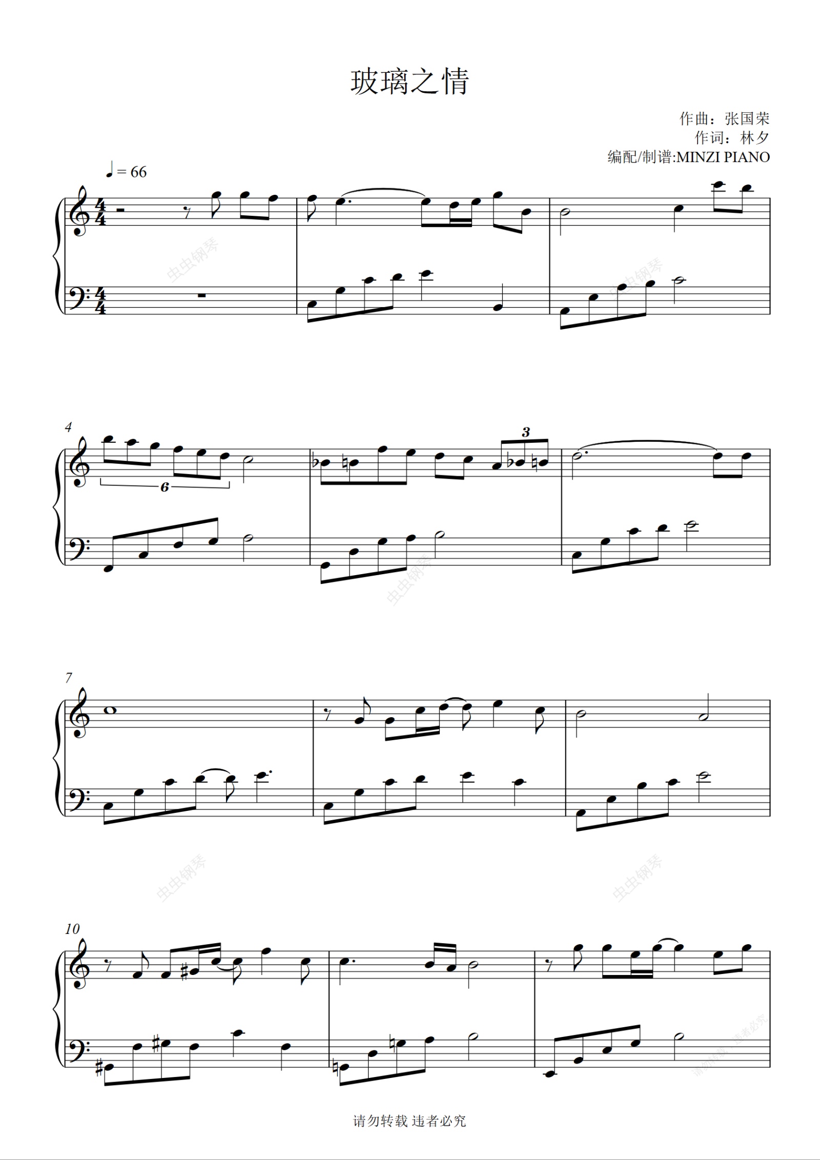 钢琴谱:张国荣《玻璃之情》好听易弹奏