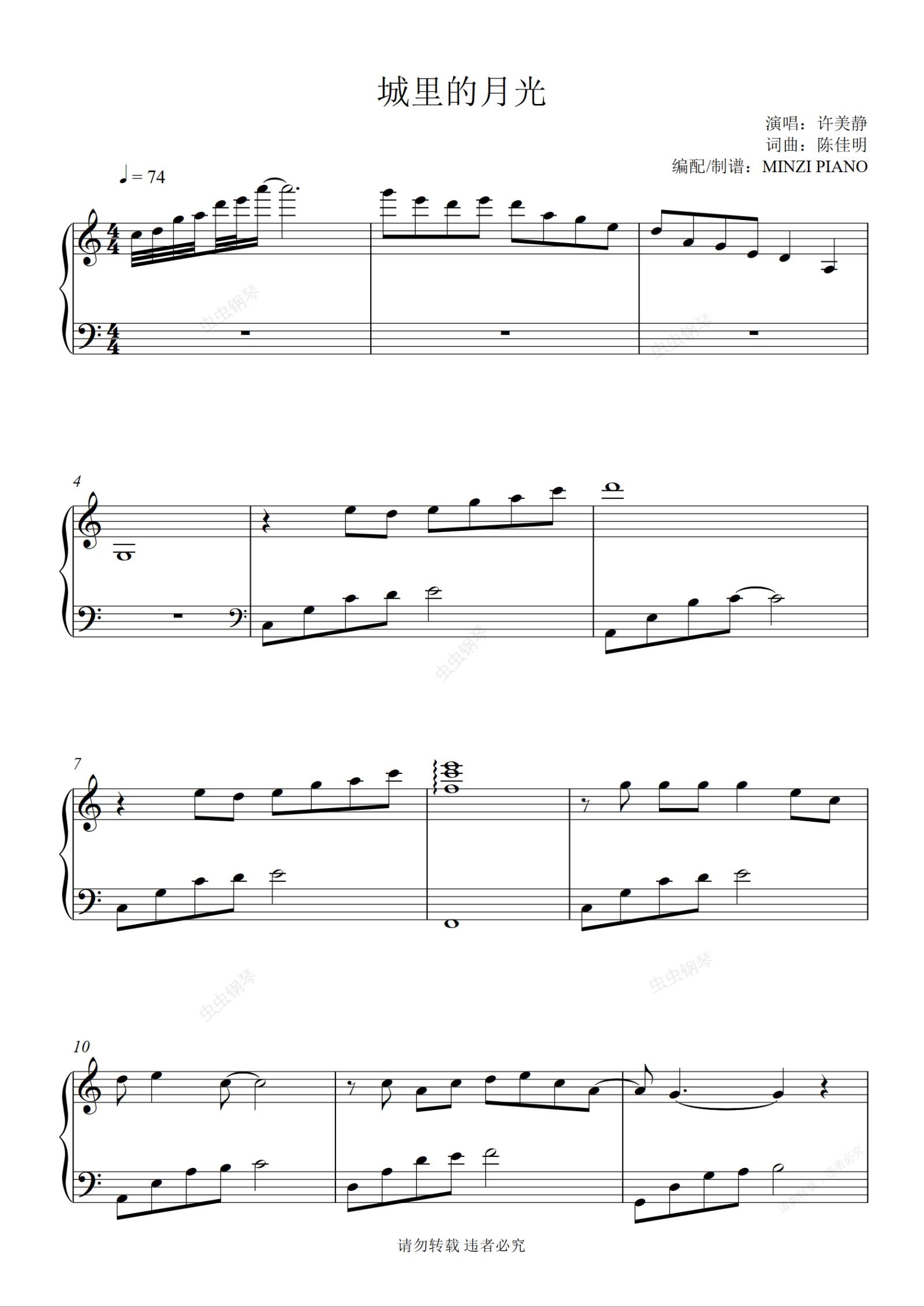 钢琴谱:许美静《城里的月光》好听易弹奏