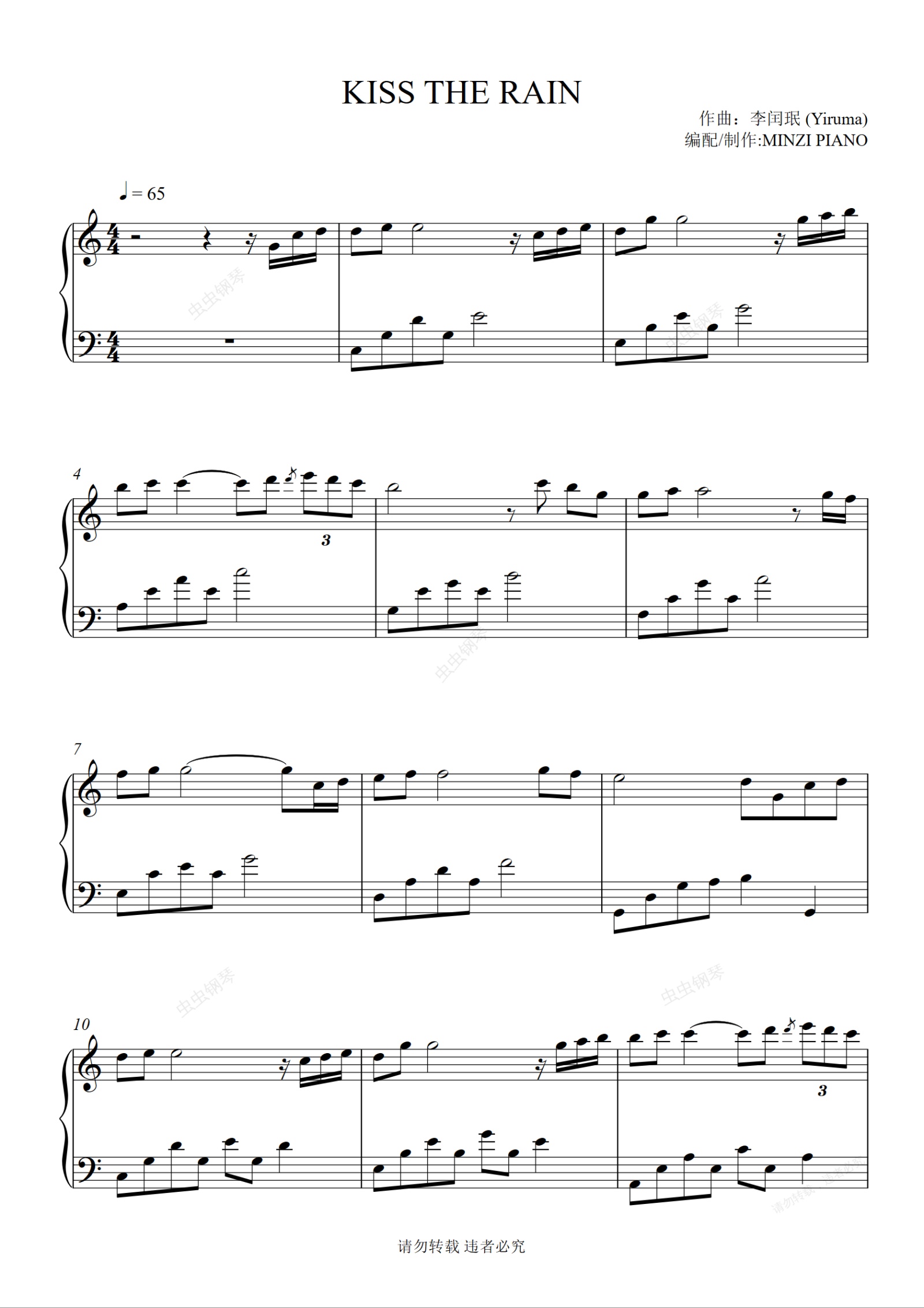 钢琴谱:C调简版《Kiss The Rain》好听易弹奏