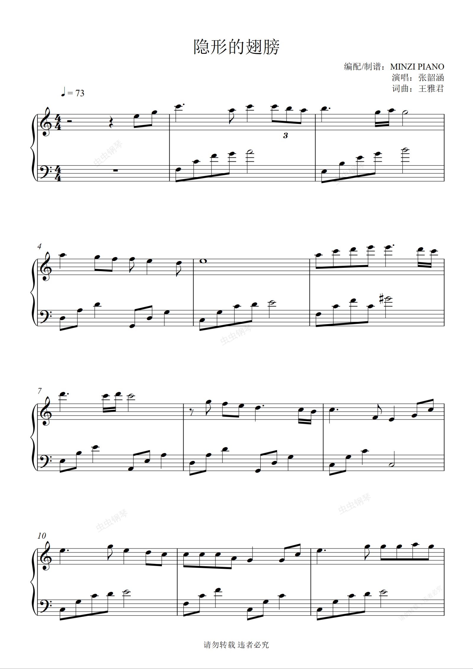 钢琴谱:张韶涵《隐形的翅膀》C调简版