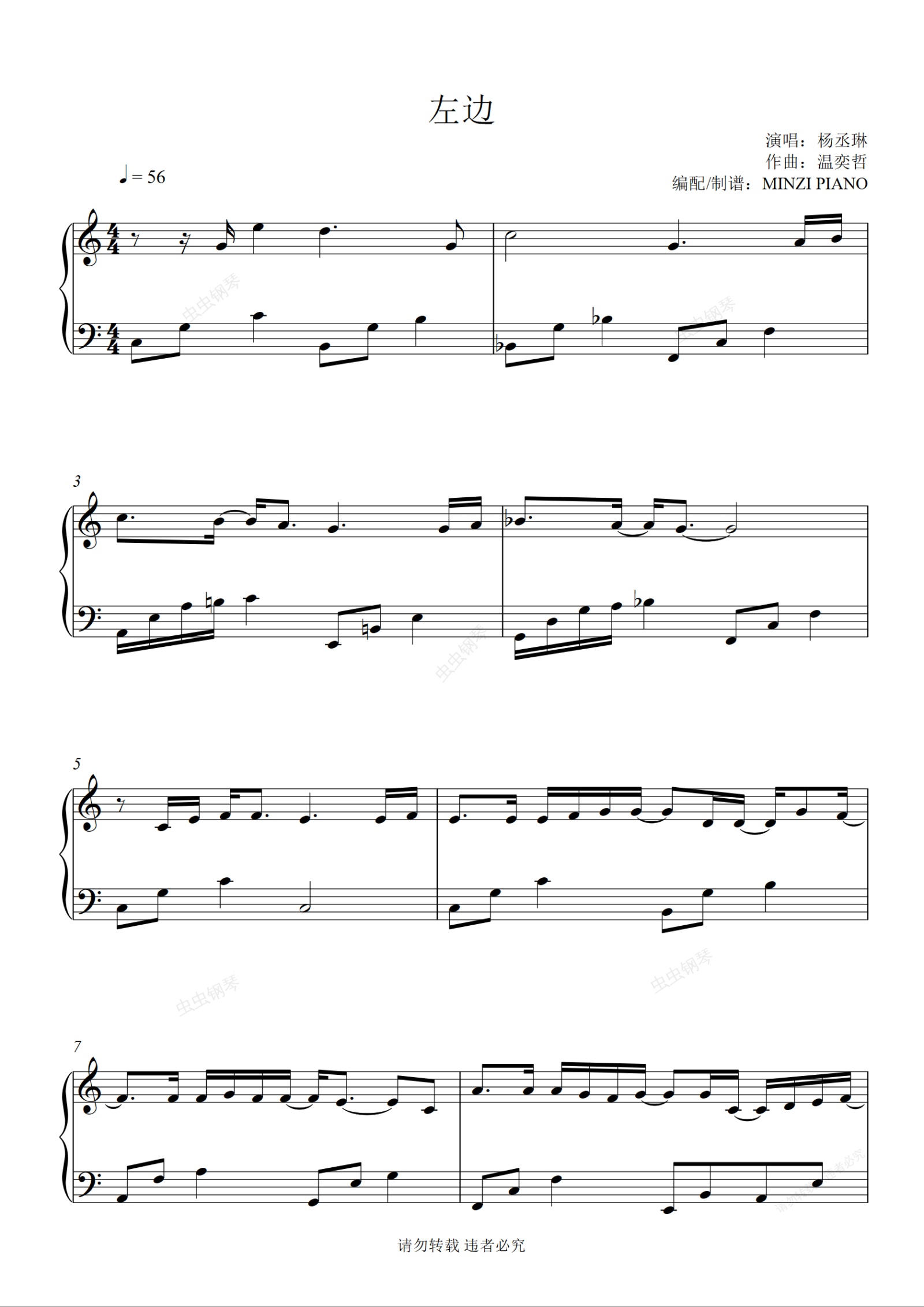 钢琴谱:杨丞琳《左边》C到简版 好听易弹奏