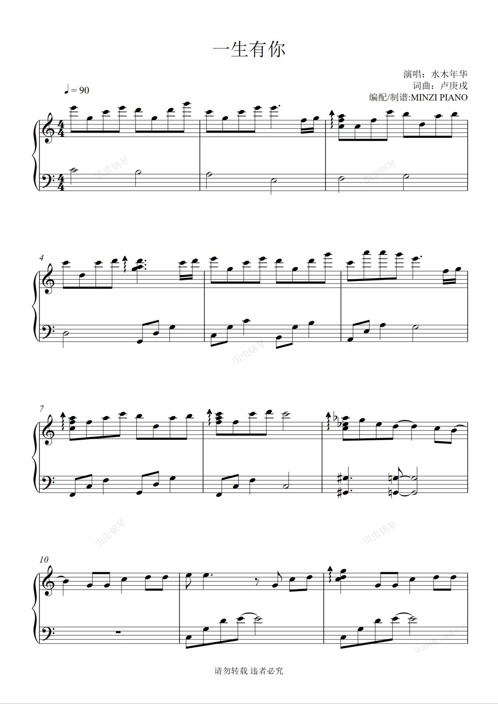 钢琴谱:水木年华《一生有你》C调 好听易演奏